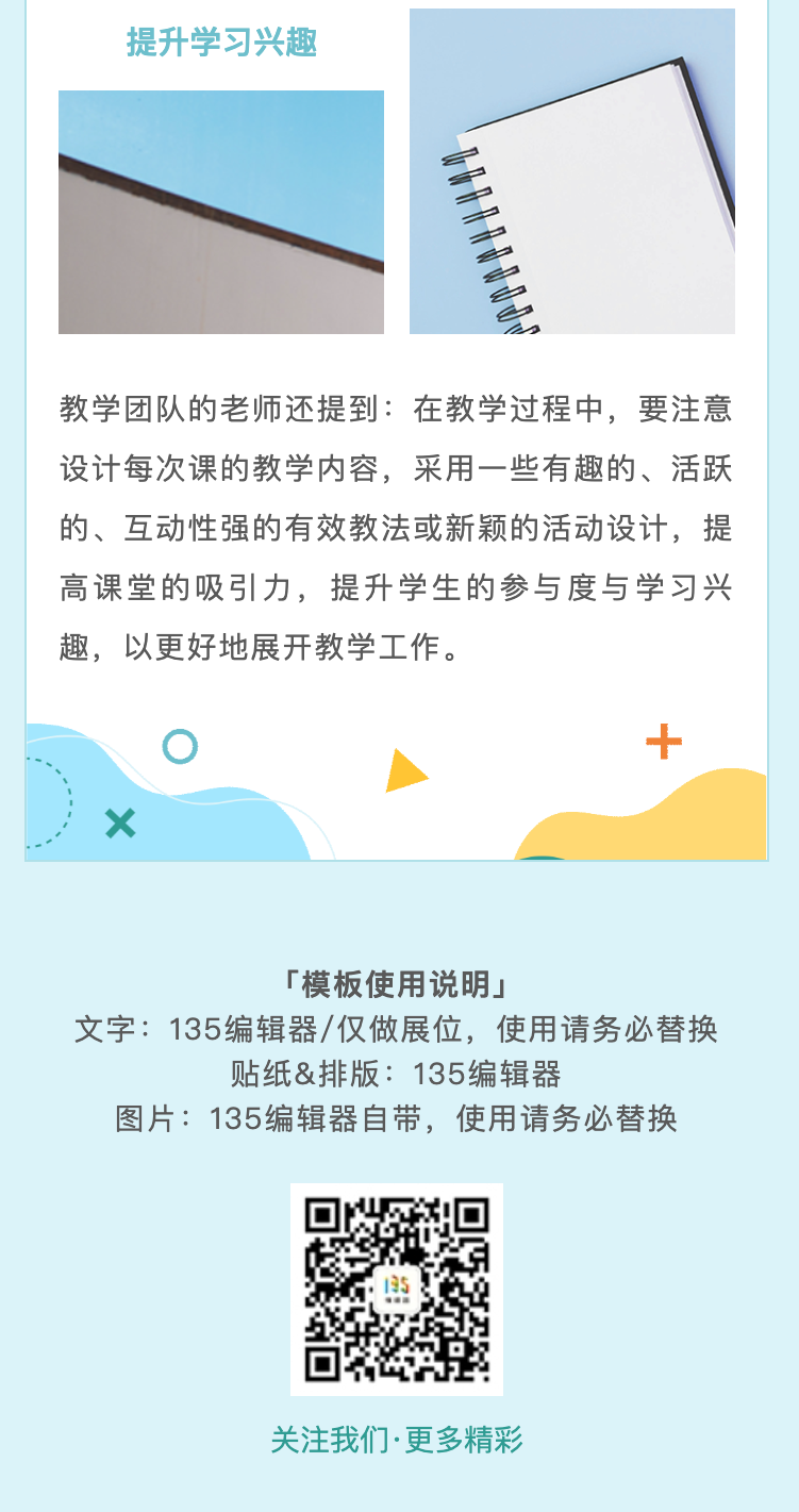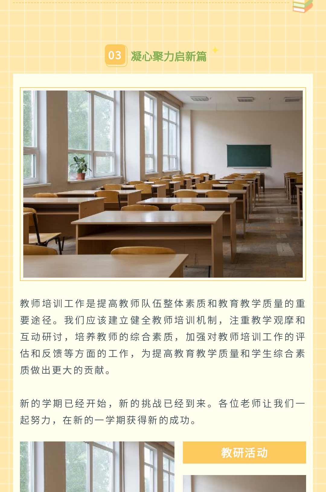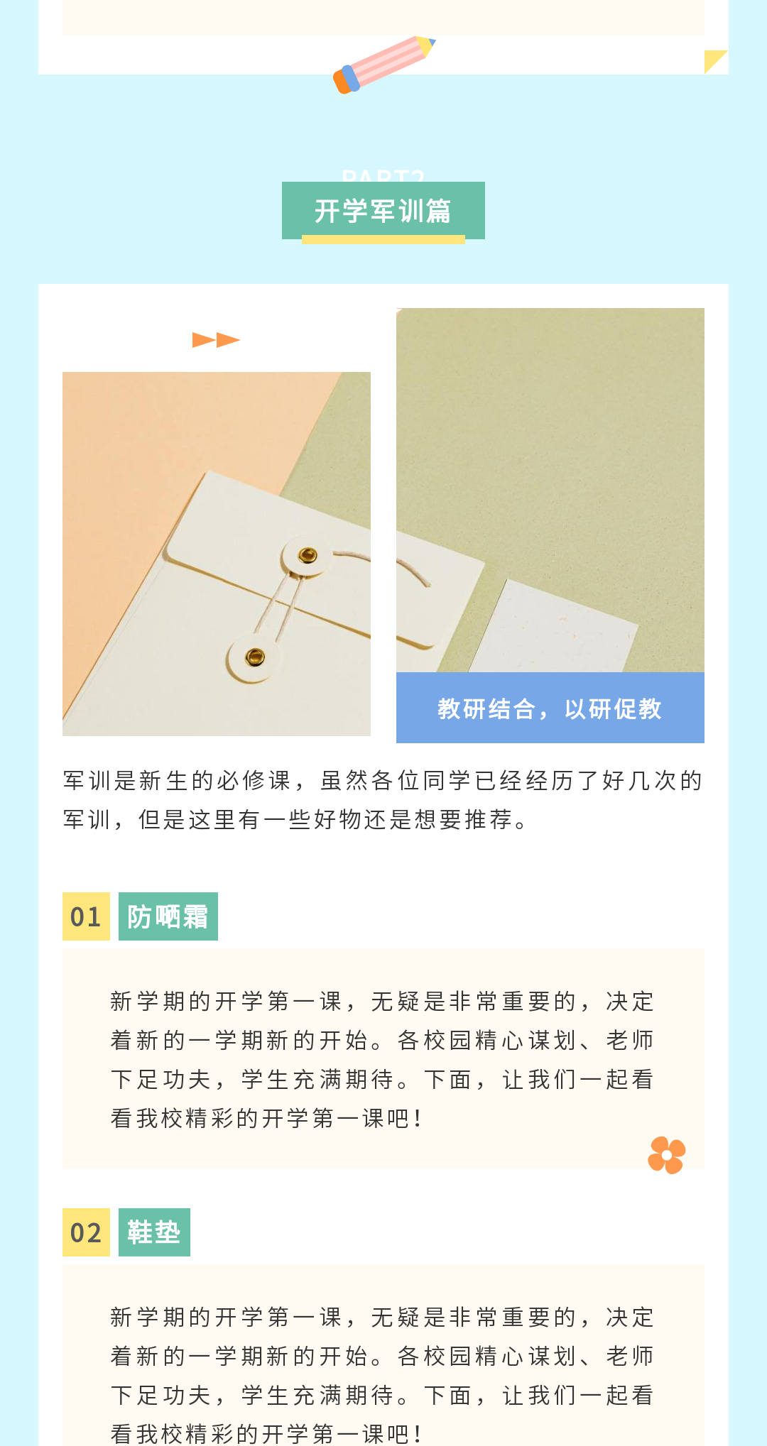 中学在开学季这个阶段主要会涉及的选题包括:开学通知、军训通知、教研活动等。排版风格主要以简约、清新风为主,排版颜色可以选择淡雅一些的颜色,比如浅蓝、淡黄等,排版元素可以选择黑板、书包、课本等。