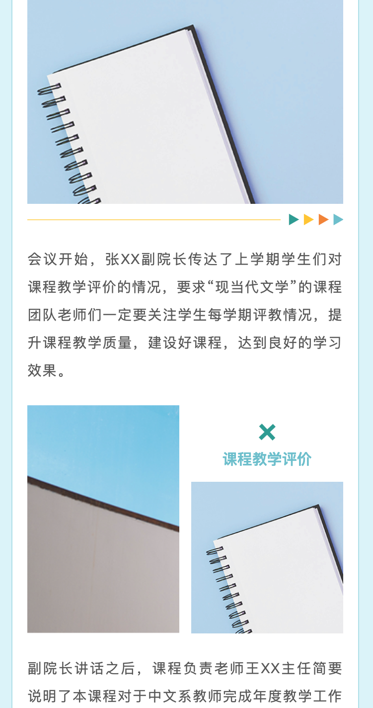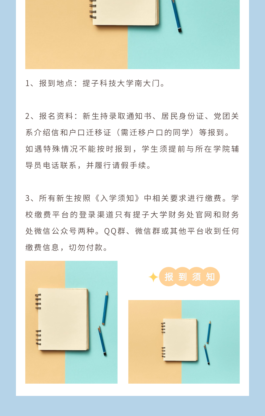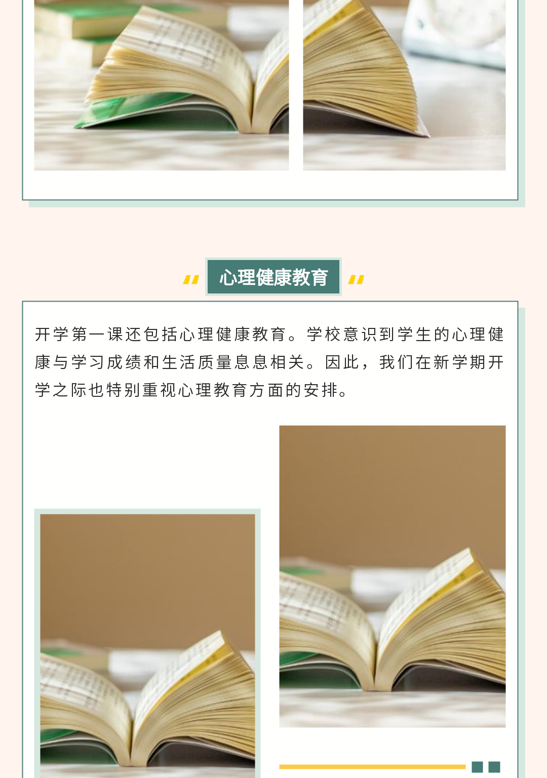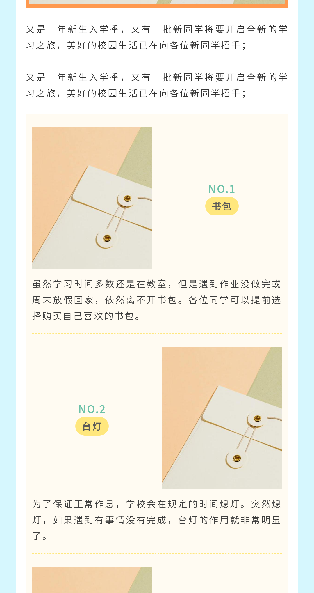 中学在开学季这个阶段主要会涉及的选题包括:开学通知、军训通知、教研活动等。排版风格主要以简约、清新风为主,排版颜色可以选择淡雅一些的颜色,比如浅蓝、淡黄等,排版元素可以选择黑板、书包、课本等。