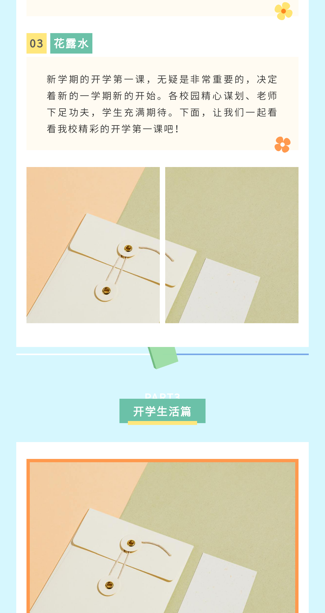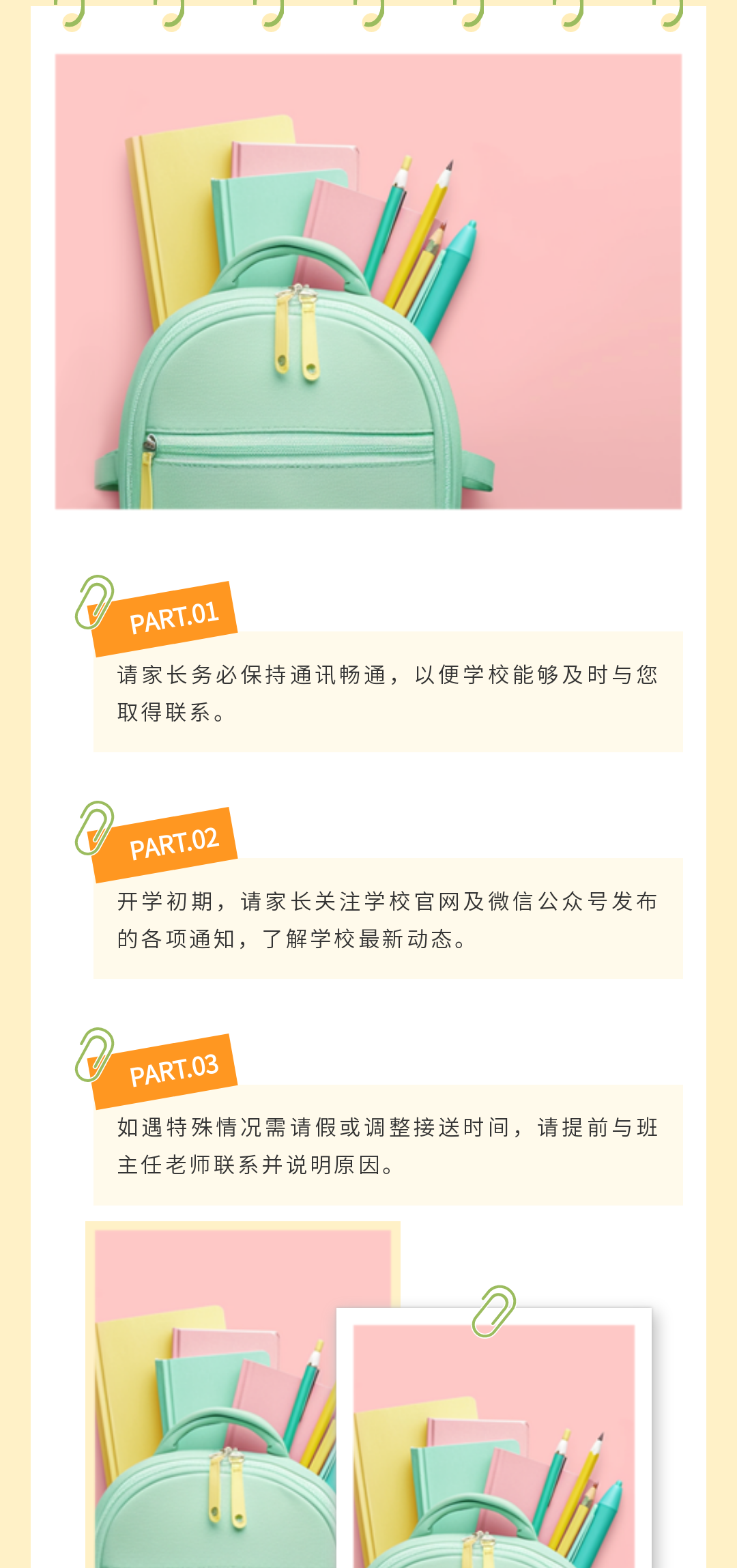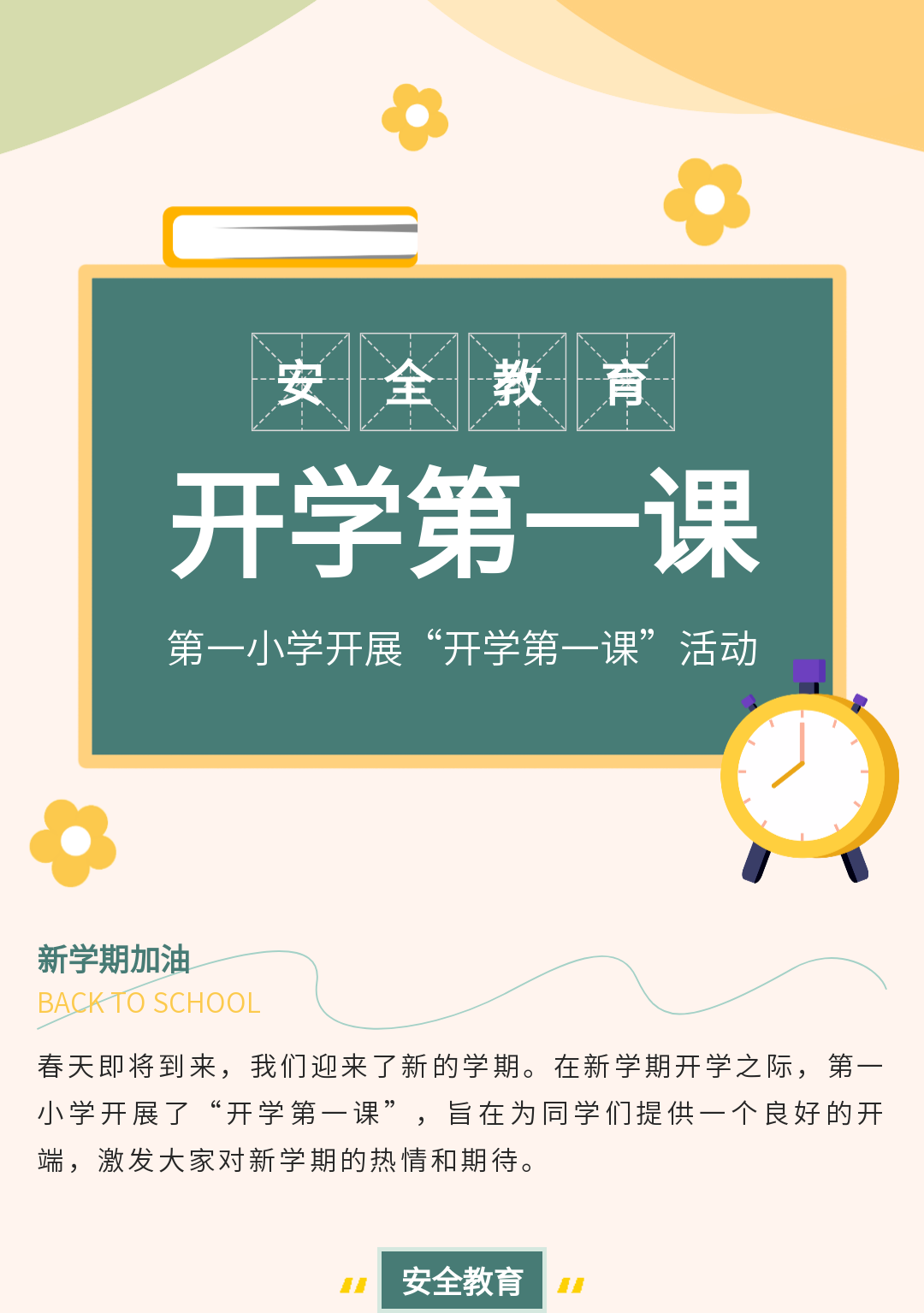 小学在开学季这个阶段主要会涉及的选题包括:开学通知、开学第一课、安全教育活动等。排版风格主要以卡通、清新风为主,排版颜色依然可以选择一些相对明亮的色彩,比如绿色、蓝色、黄色等,选择的排版元素可以根据主题内容挑选。