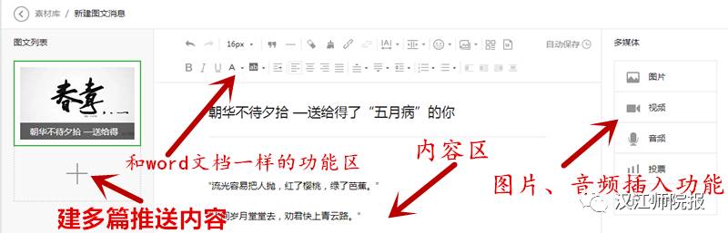 ·左侧是【图文列表】,点+可以再新建一篇内容,群发时一起发送