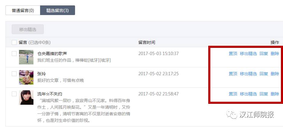 这里可以把比较好的回复选入精选,同时要及时回复留言