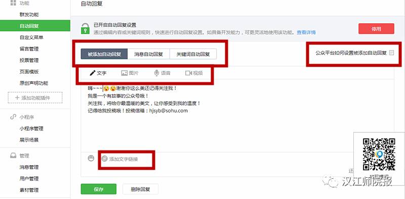 别人在后台留言时,可以添加一些回复,系统根据内容自动回复(这个功能就自己摸索啦