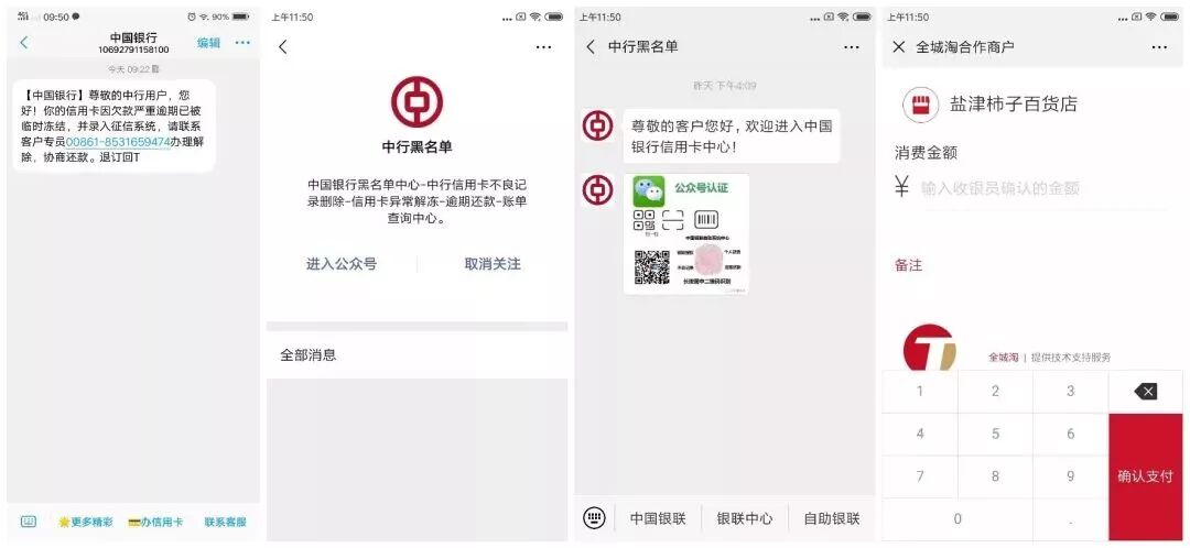 诈骗团伙通过短信的方式,以用户信用卡逾期名义,通过客服将用户引导至仿冒的银行公众号上进行扫码支付,而收款方实际与银行无关。