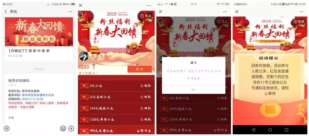 春节期间,部分公众号以新春回馈粉丝的名义,向用户推送虚假的双倍红包返利活动的外部链接。这些外部链接以不同节日为由头,声称充值红包后可获取翻倍红包,并先以低额度的红包返现欺骗用户,在用户充值高额红包后不再返现。
