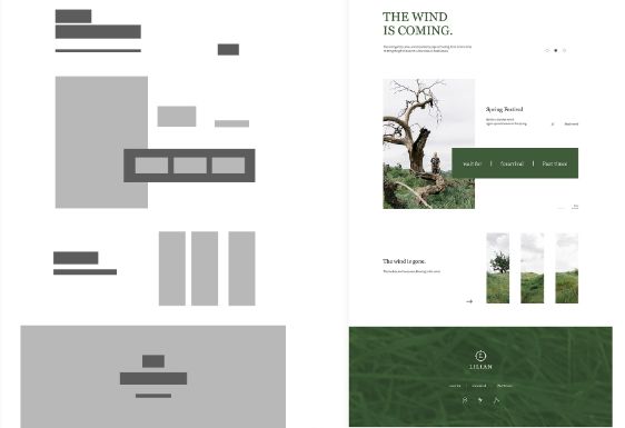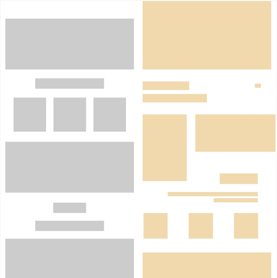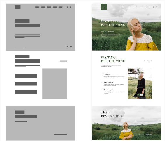 上图左边页面结构,看起来就会显得稳定常规一些,而右边则新颖一些,当然分割不止是大版面,由大而小,大版面分完了就需要从店招开始依次往下进行小版面的分割,最后去填充内容,具体填充手法就看个人设计功底了,下面实际举例,左边为我创作之前的版面分割,大到页面布局,小到某个地方的排版,都是事先分割好的。