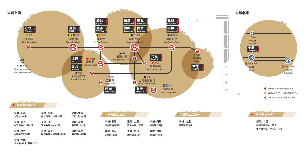 而如果你放大到地图上去看,米域目前16个新空间项目均集中在上海南京西路、南京东路、淮海路、陆家嘴、外滩和北京朝阳区等超核心地段,地铁附近500米步行可达。