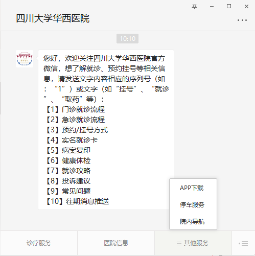 功能服务则体现在菜单栏和自动回复的设计上,可以在公众号上在线挂号、缴费、查报告和缴费等,非常人性化服务。如下↓