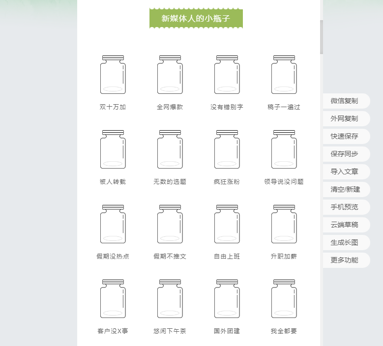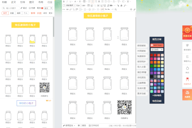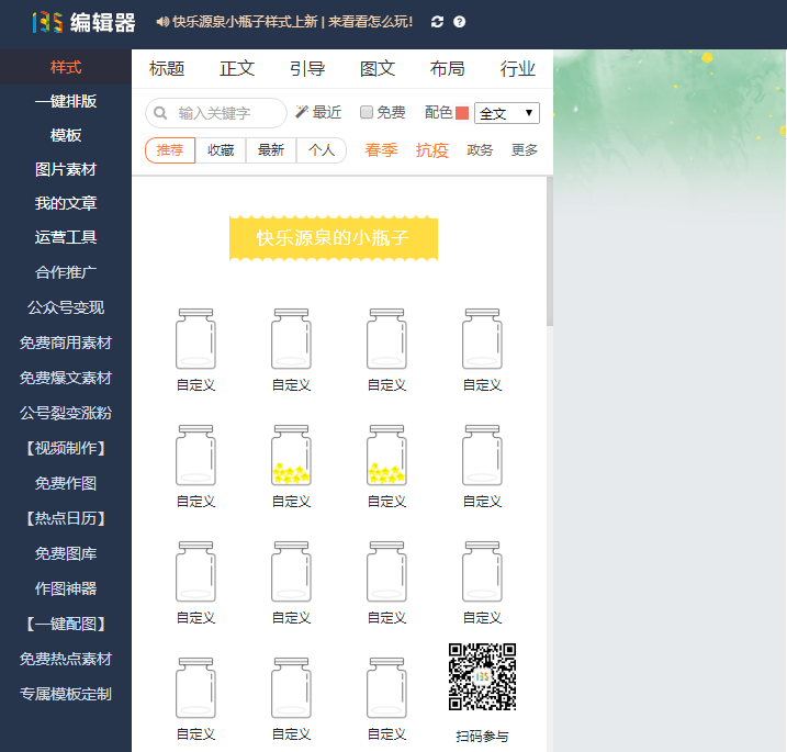 打开135编辑器,在左侧样式选区中点击『推荐』,第一个就是我们新出的小瓶子样式哦!