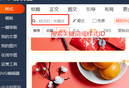 在编辑器左侧工具栏中选择【样式】后在搜索框中搜索【春节】或是输入样式ID,查找新春样式。
