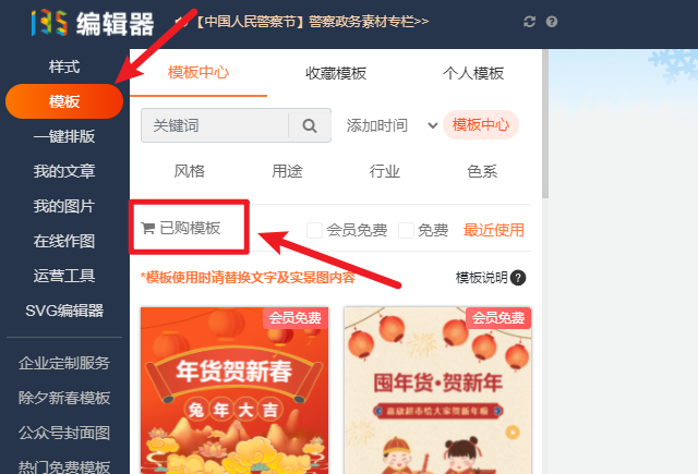 购买后请在编辑器界面最左侧的【模板】👉【已购模板】中选择已购买的模板进行编辑排版。
