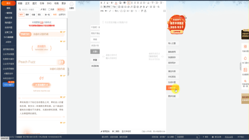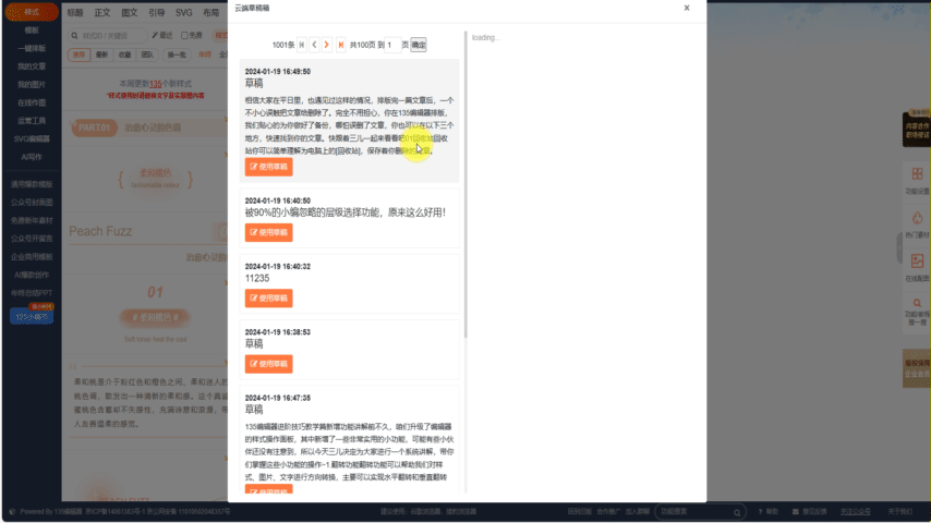 135编辑器所有的会员用户在排版时,文章素材每5分钟会自动上传至135编辑器的云端服务器中,如果你排版的文章发生意外丢失或清空,可以在云端草稿中查找最近一次保存的文稿。