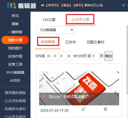 如果是误删了已经保存同步到微信后台的文章(在135编辑器删除了保存的文章),可以点击[我的文章]-[公众号文章]-[微信草稿]就能找到已同步到微信后台的文章。