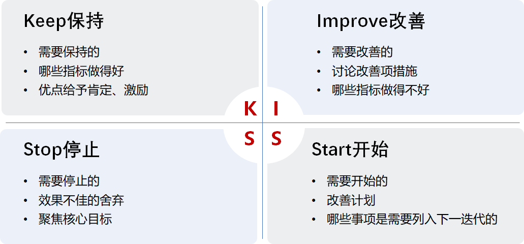 Keep(保持):哪些做得好的,令人满意的点,总结经验,后续继续保持,巩固劳动成果。