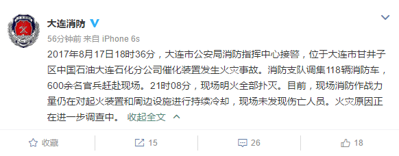 8月17日电(记者 孙钊 李永鹏)今日下午18时40分,中石油大连石化分公司发生一起火灾事故。据大连市公安局消防支队通报称,火灾发生后,消防支队调集118辆消防车,600余名官兵赶赴现场。至21时许,现场明火已被扑灭,无人员伤亡。事故原因正在调查。 -