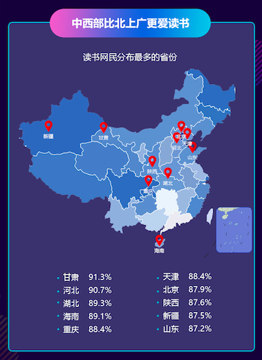 从读书网民的地域分布来看,中西部地区比北上广地区的读书网民更多,其中分布最多的十大省份是甘肃、河北、湖北、海南、重庆、天津、北京、陕西、新疆、山东。从读书时长来看,中西部地区的网民阅读时间也相对更长,其中宁夏、甘肃、内蒙古等省份每天读书超过一小时的网民占比要高于北上广地区。中西部地区相对北上广等发达地区工作节奏较慢、生活娱乐设施和文化活动相对较少,对这些地区的人而言,阅读不失为一种很好的消遣方式。