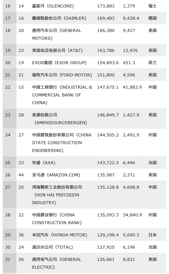 此外,员工人数最多的企业是沃尔玛和中石油,分别为230万和151万员工。去年前50家公司中跃升最快的是亚马逊,排名提升了18位。在全部去年上榜公司中跃升最快的十家公司中有三家来自中国大陆,它们是:中国五矿(上升203位)、海航集团(上升183位)和中国恒大集团(上升158位)。