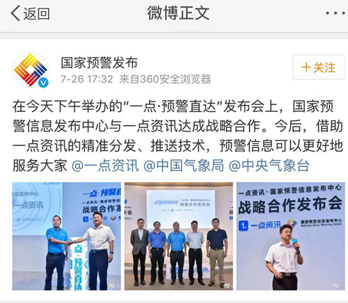 据悉,一点资讯将全面接入国家预警信息发布中心在自然灾害、事故灾难、公共卫生事件、社会安全事件四大类突发事件的相关预警信息,并利用大数据分析能力和精准分发技术等平台优势,让国家预警信息发布中心权威、实时的预警信息资源精准触达相关区域用户。未来,双方也将在平台、内容、数据等各层面进行全方位合作。