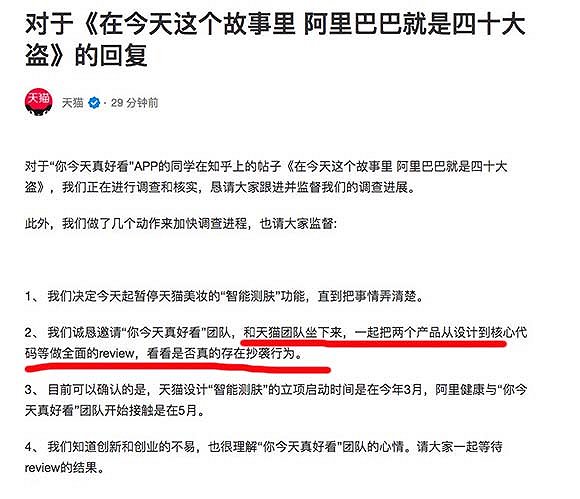 9月28日下午,阿里巴巴天猫团队发表了公开声明。称“天猫设计‘智能测肤’的立项启动时间是在今年3月,阿里健康与‘你今天真好看’团队开始接触是在5月。”