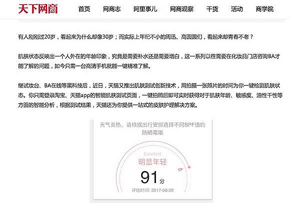 8月29日,天下网商曾经发表过一篇针对该产品的文章,详细表述了这项“天猫肌肤测试创新技术”。