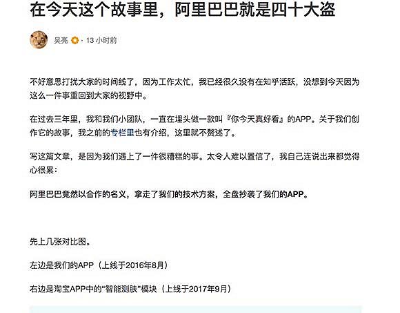 文中以详细的图文方式记录了一位做线上皮肤测试的创业公司,控诉阿里巴巴“竟然以合作的名义,拿走了我们的技术方案,全盘抄袭了我们的APP”。