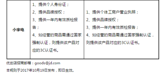 “食品、影视、音乐三个类目仅面向个体工商户招商,暂未向个人开放。”爆料人士指出,由于该方案仍处于内测中,开放的类目并不多,目前邀请了小部分商家在进行测试。目前,京东还仅以邮件的方式进行招商,其他入口均不接受。
