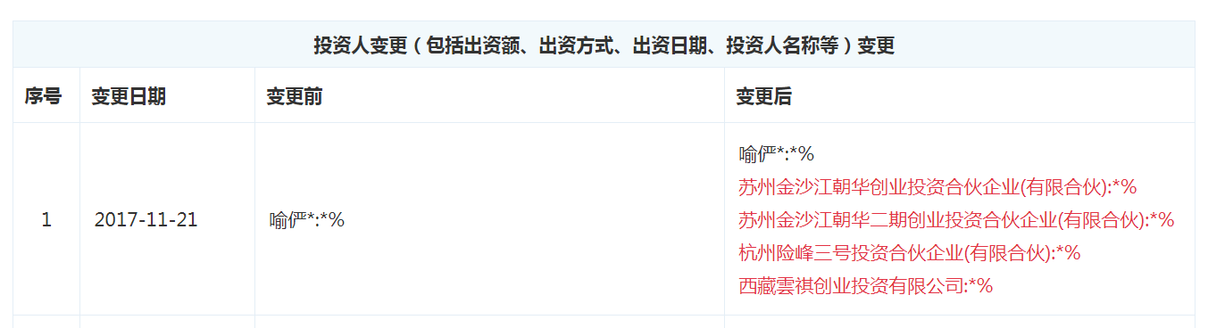 2017年11月21日,武汉从心信息科技有限公司工商信息发生变更,注册资本扩充由10万元增加至12.5万元人民币,并新增4个企业股东——苏州金沙江朝华创业投资合伙企业(有限合伙)、苏州金沙江朝华二期创业投资合伙企业(有限合伙)、杭州险峰三号投资合伙企业(有限合伙)以及西藏雲祺创业投资有限公司。具体情况见下图: