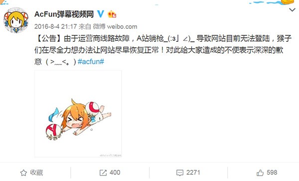 根据A站官方网站在2016年8月6月发布的消息,因为A站提供服务的网络运营商机房出现意外状况,AcFun于8月4日13时33分开始无法进行访问。根据A站声明,“经过猴子们通宵紧张地工作,在8月6日 2时56分,备份还原工作顺利完成,稿件数据已部分恢复,基础功能已能正常使用。在服务器转移工作过程中,访问可能会受到短暂的影响。待全部工作完成后,AcFun将逐步恢复正常使用。”