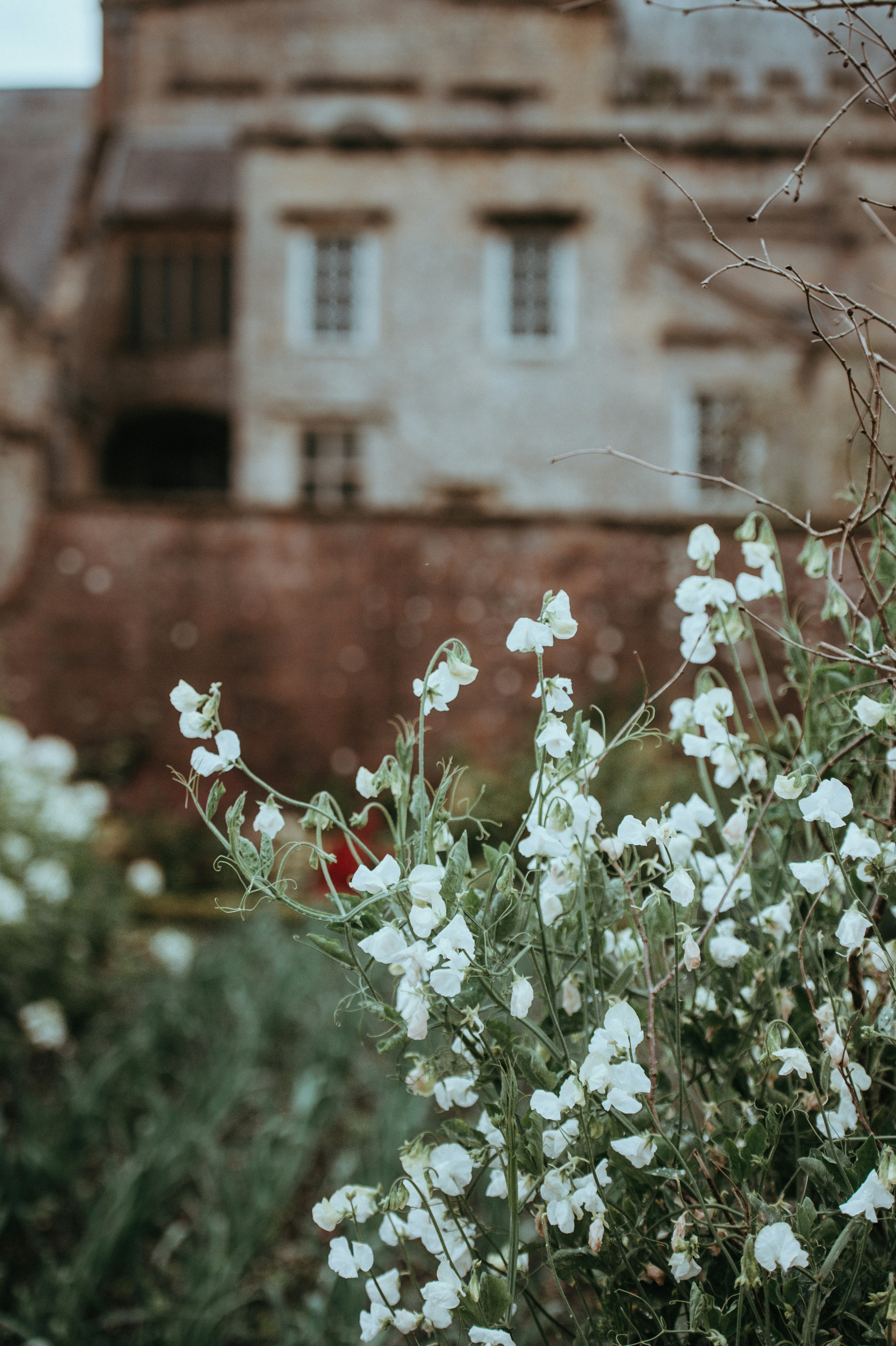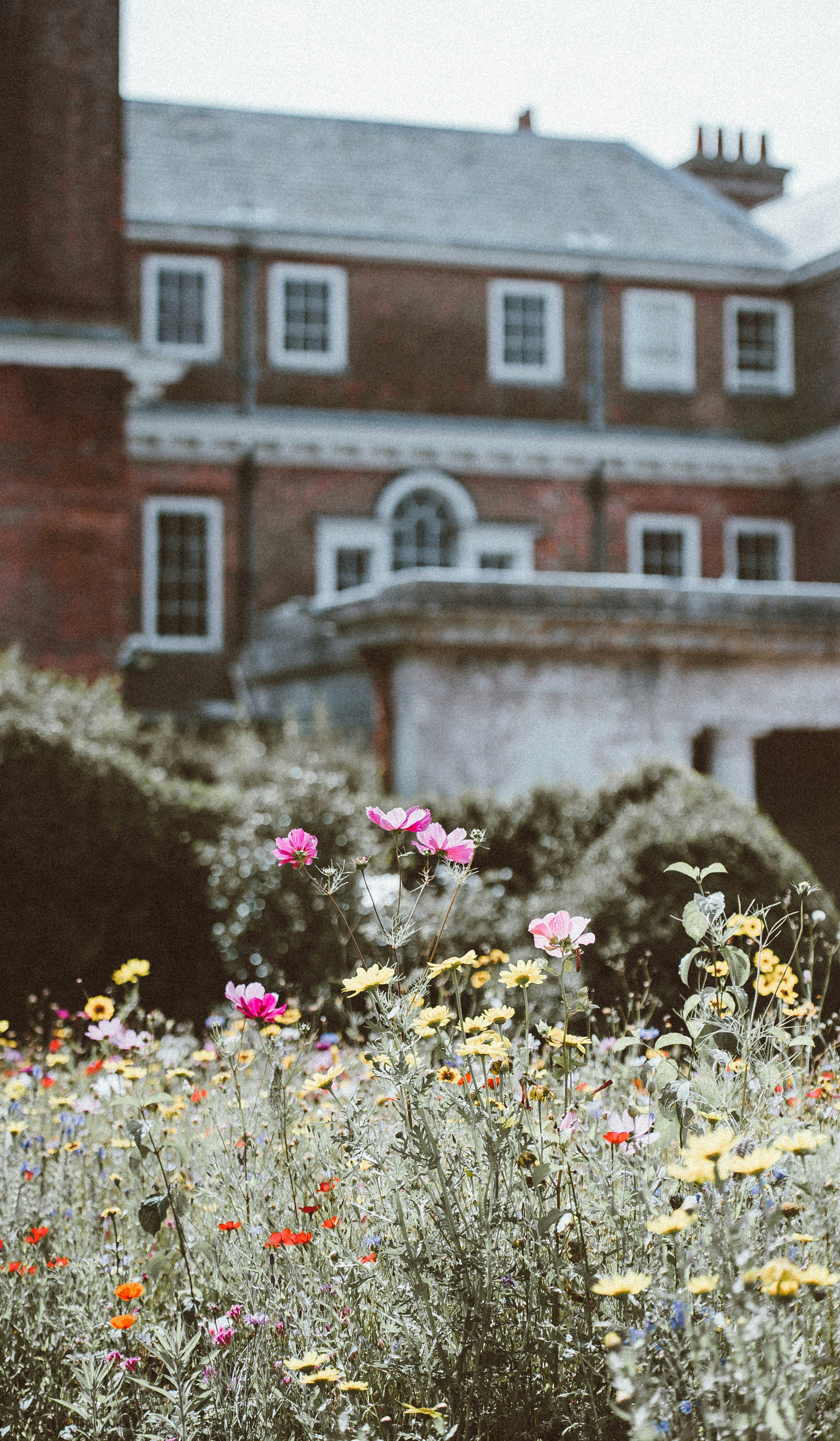 豪宅、房子、花园、墙、砖、窗、烟囱、花朵、草地、草地、灌木、树木、混凝土、石头、模糊、乡村别墅、雏菊、罂粟、野花、建筑