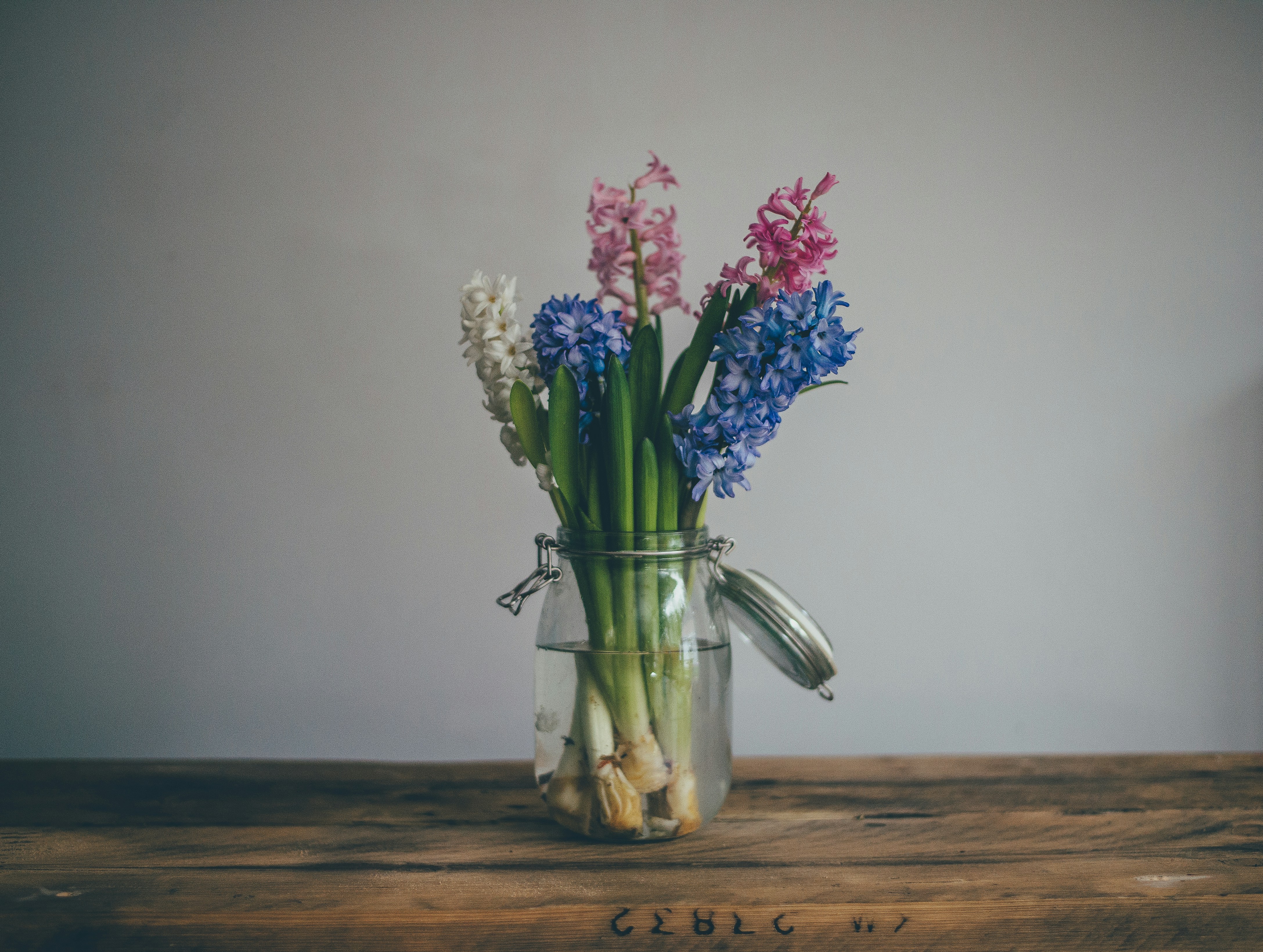 花卉,花卉,花瓶,罐子,玻璃,水,桌子,家庭,装饰,白色,墙壁,蓝色,粉色
