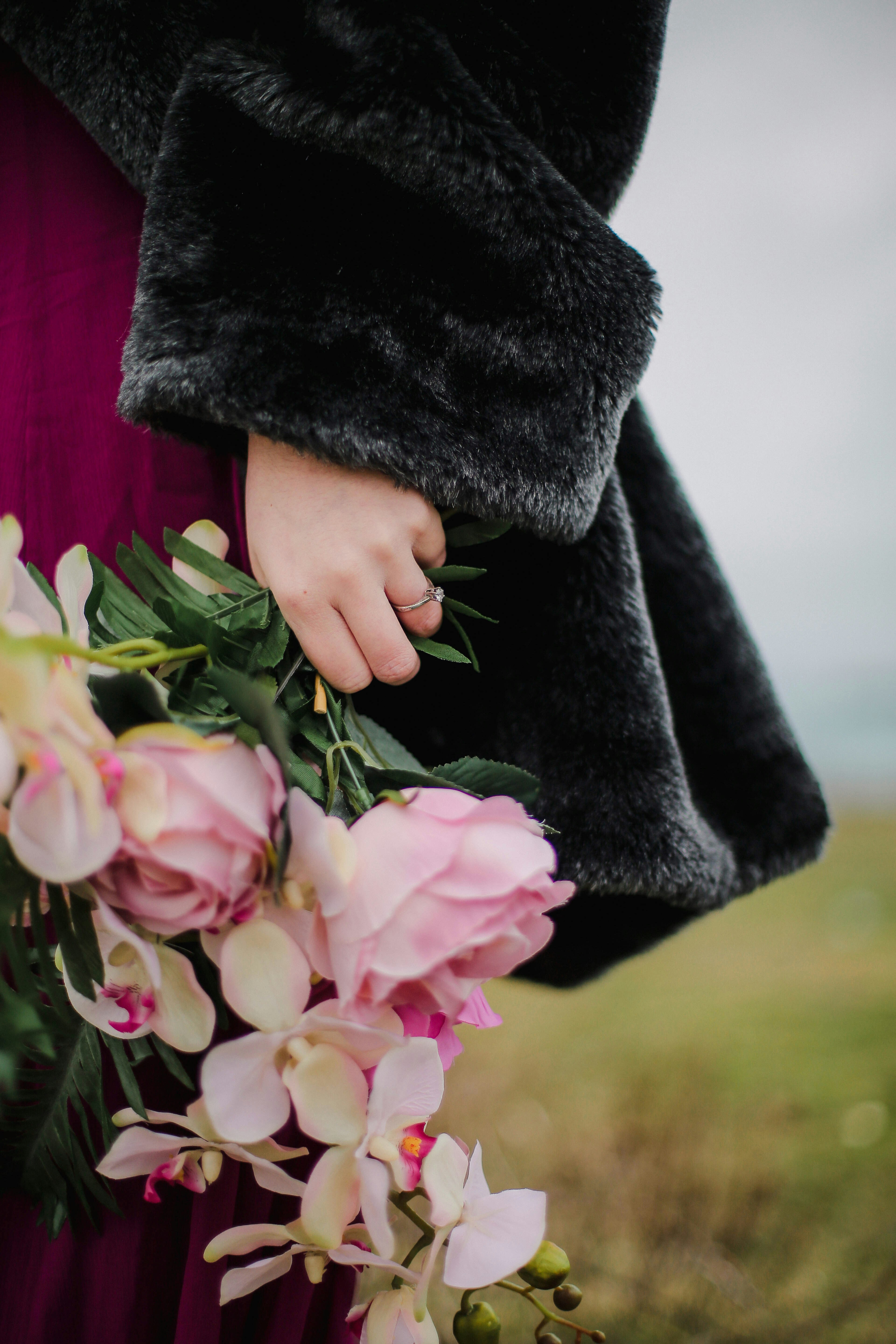采购产品,花卉,花束,毛皮外套,订婚,未婚妻,女人,玫瑰,兰花,黑色外套,粉红色,细节