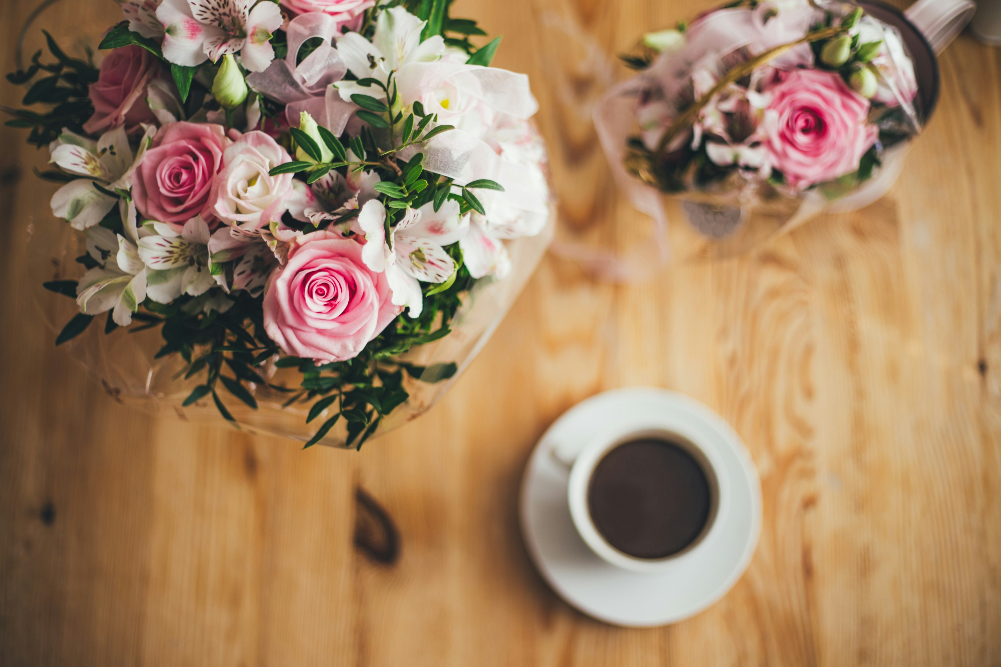 鲜花,桌子,咖啡,木头,粉色,绿色,自顶向下,星期日,美丽,壁纸,自然