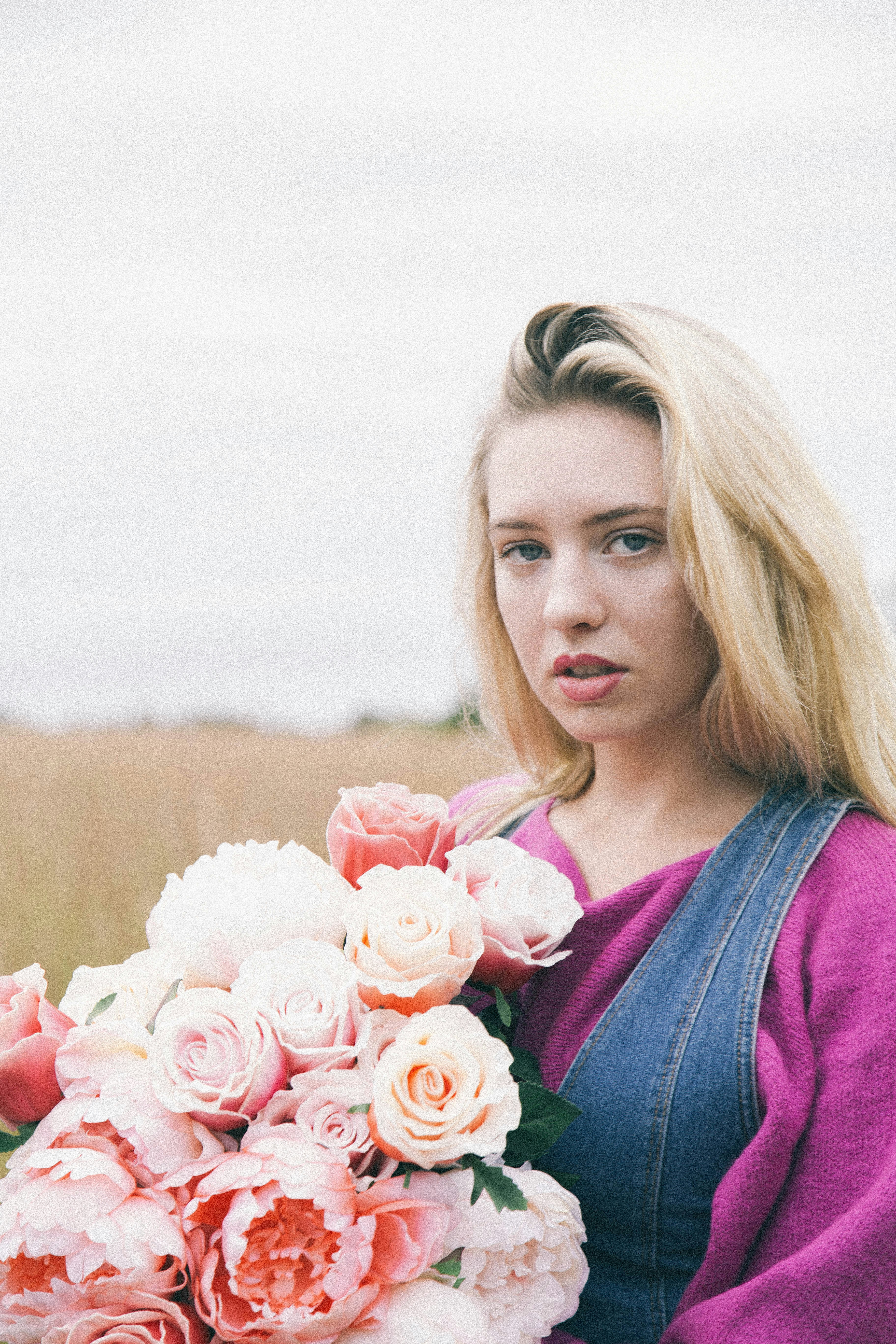 女人,女人,金发碧眼,画像,鲜花,玫瑰,粉色,喜怒无常,田野,人