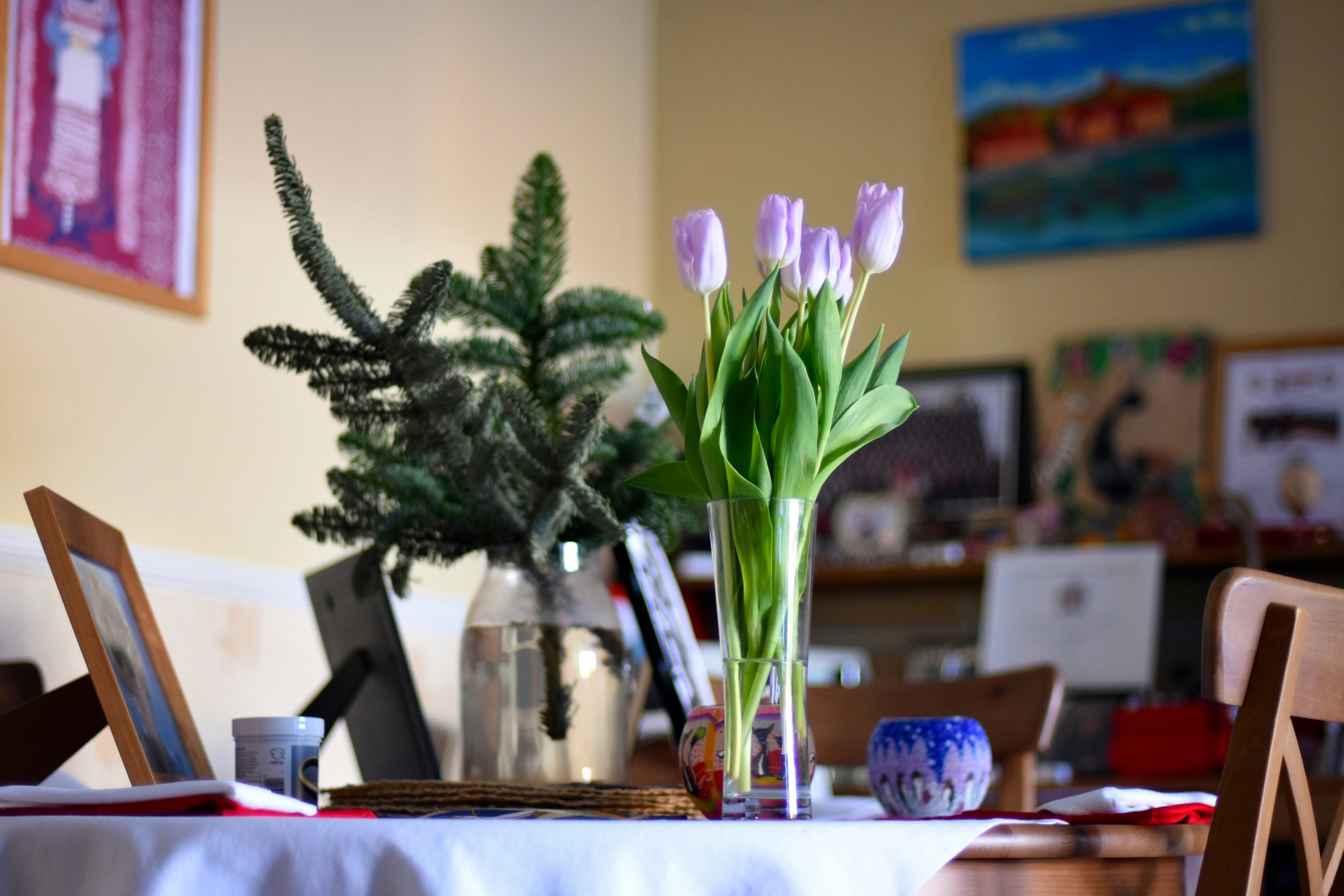 花,郁金香,紫色,花瓶,玻璃,桌子,树叶,树枝,家居,装饰,图片,墙壁,艺术,椅子,室内