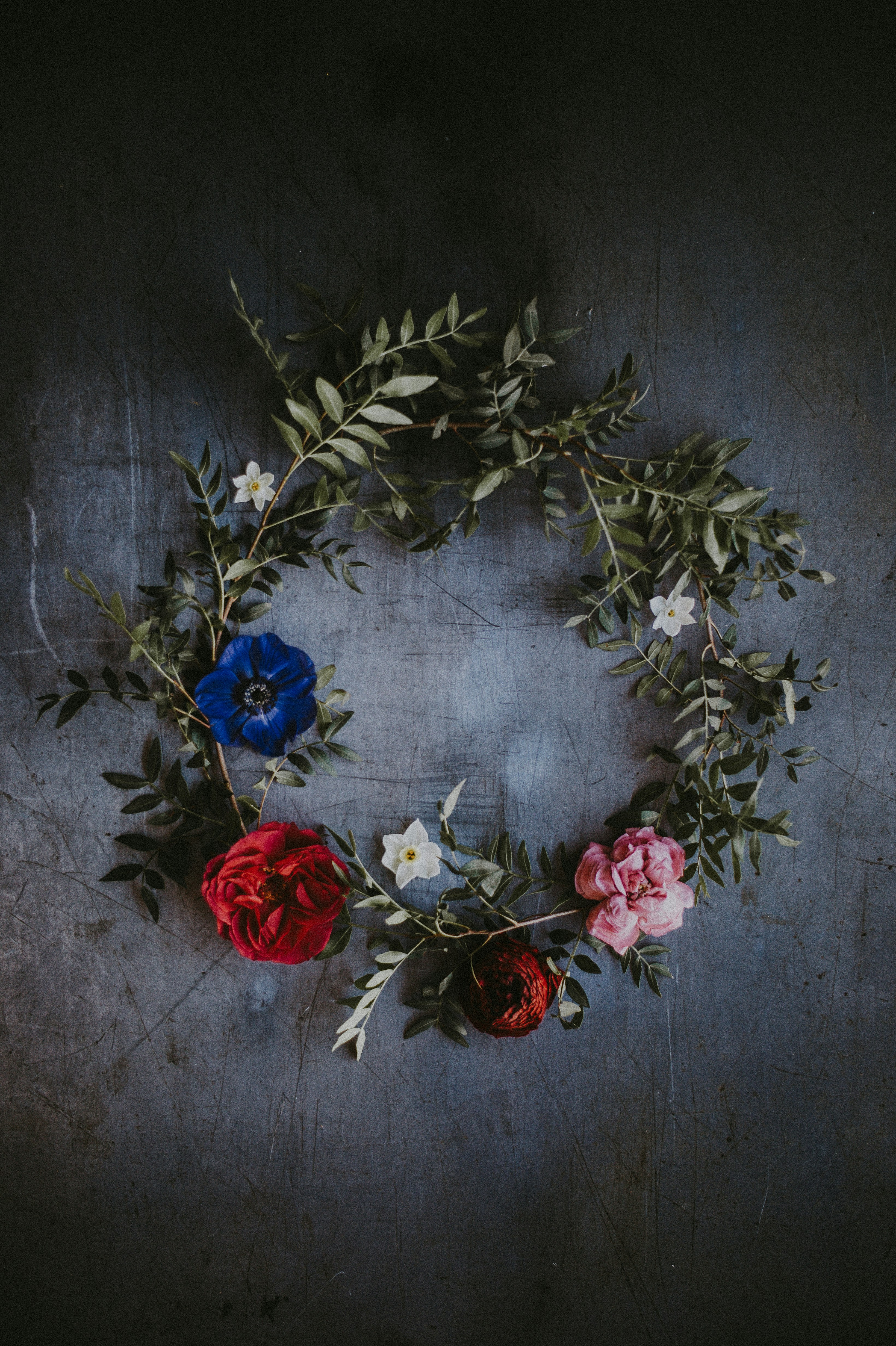 花圈,花卉,最小,极简主义,花卉,圆形,自然,圆形,灰色,纹理,树叶,颜色,颜色,红色,蓝色,粉色,绿色,装饰,工艺,狡猾