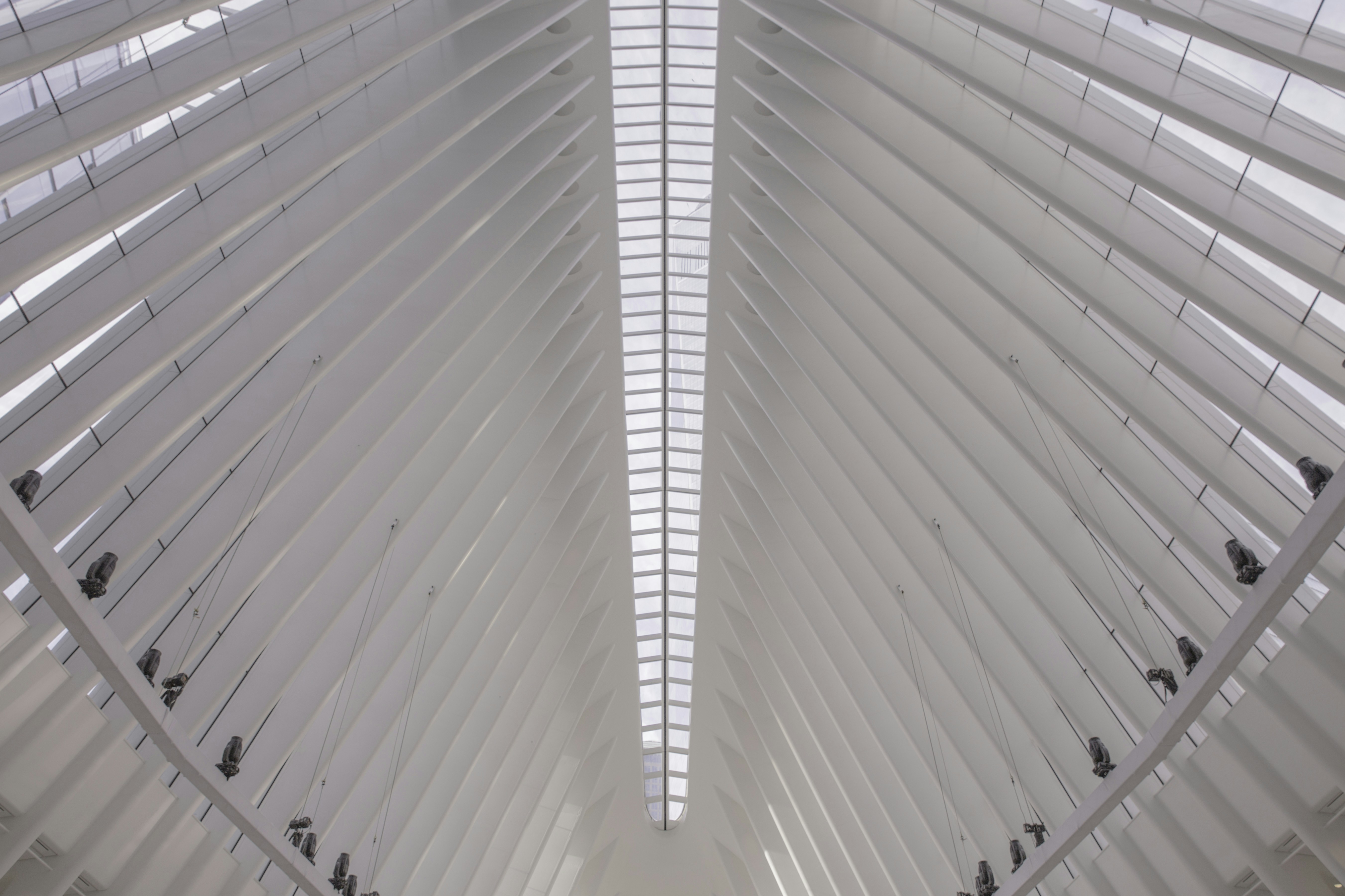 天花板,现代天花板,白色,商场,建筑,室内,设计,笔画,图案,对称,对称,对称,建筑,圣地亚哥CalATRAVA,Oculu,Call,曼哈顿,世界贸易中心,纽约