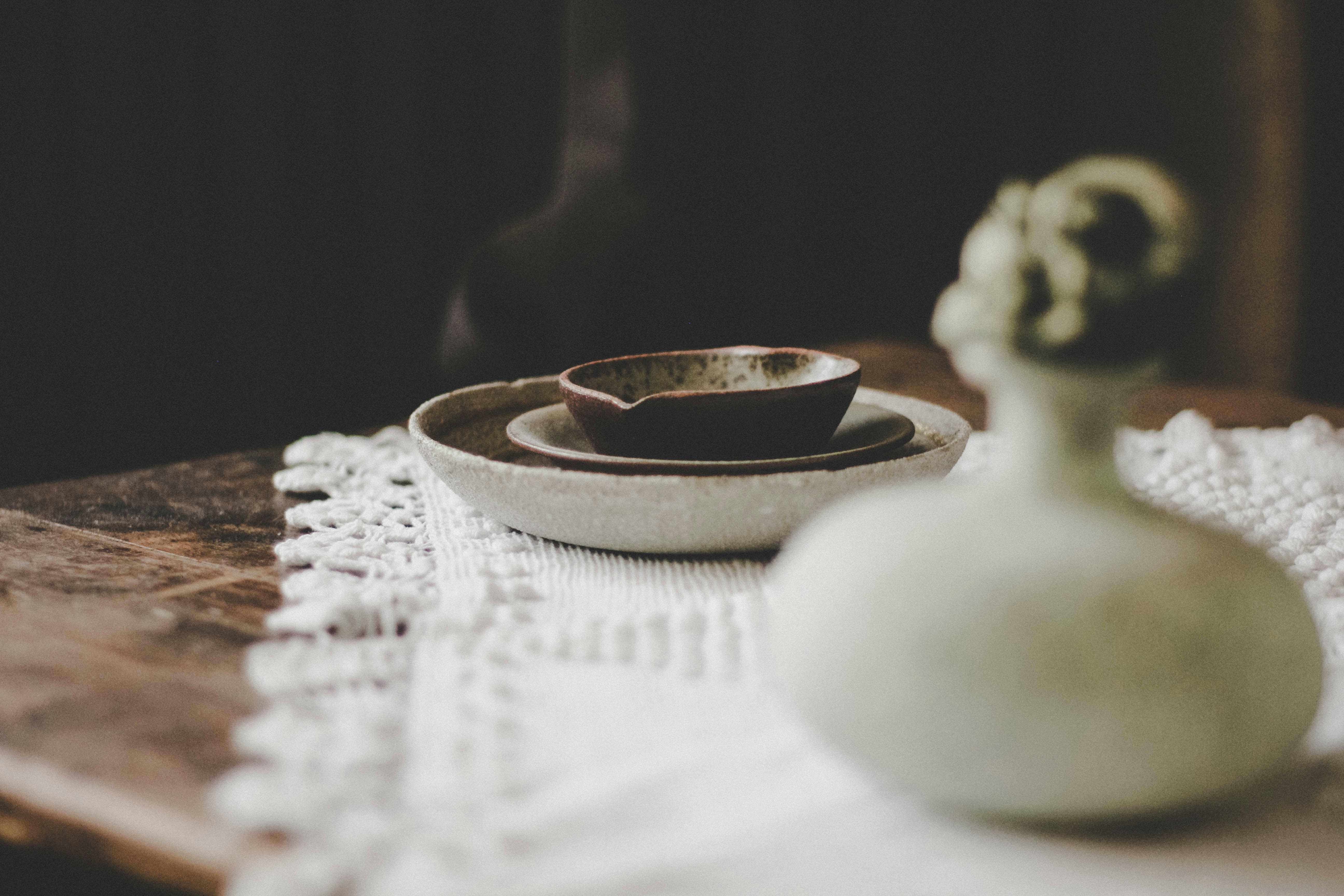 盘子,碗,葫芦,桌子,木头,布,内部,老式,设计,工艺,厨房,锅,简单,极小,烹饪,早晨