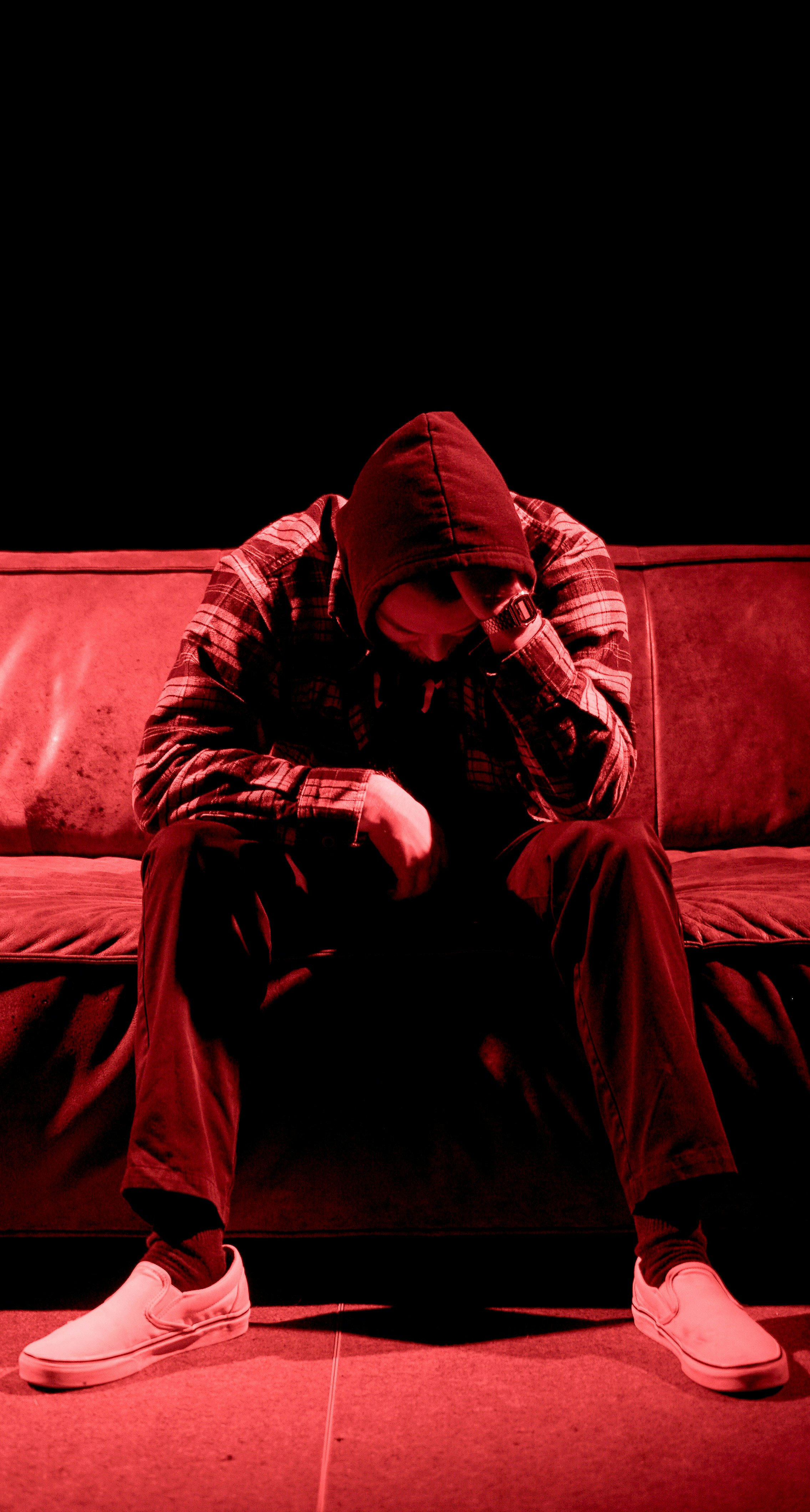 人,坐着,兜帽,手拿头,平面,格子布,往下看,男人,男性,深色,红色,沙发,沙发,沙发,室内,黑色,手表,腕表,上衣,鞋子,运动鞋