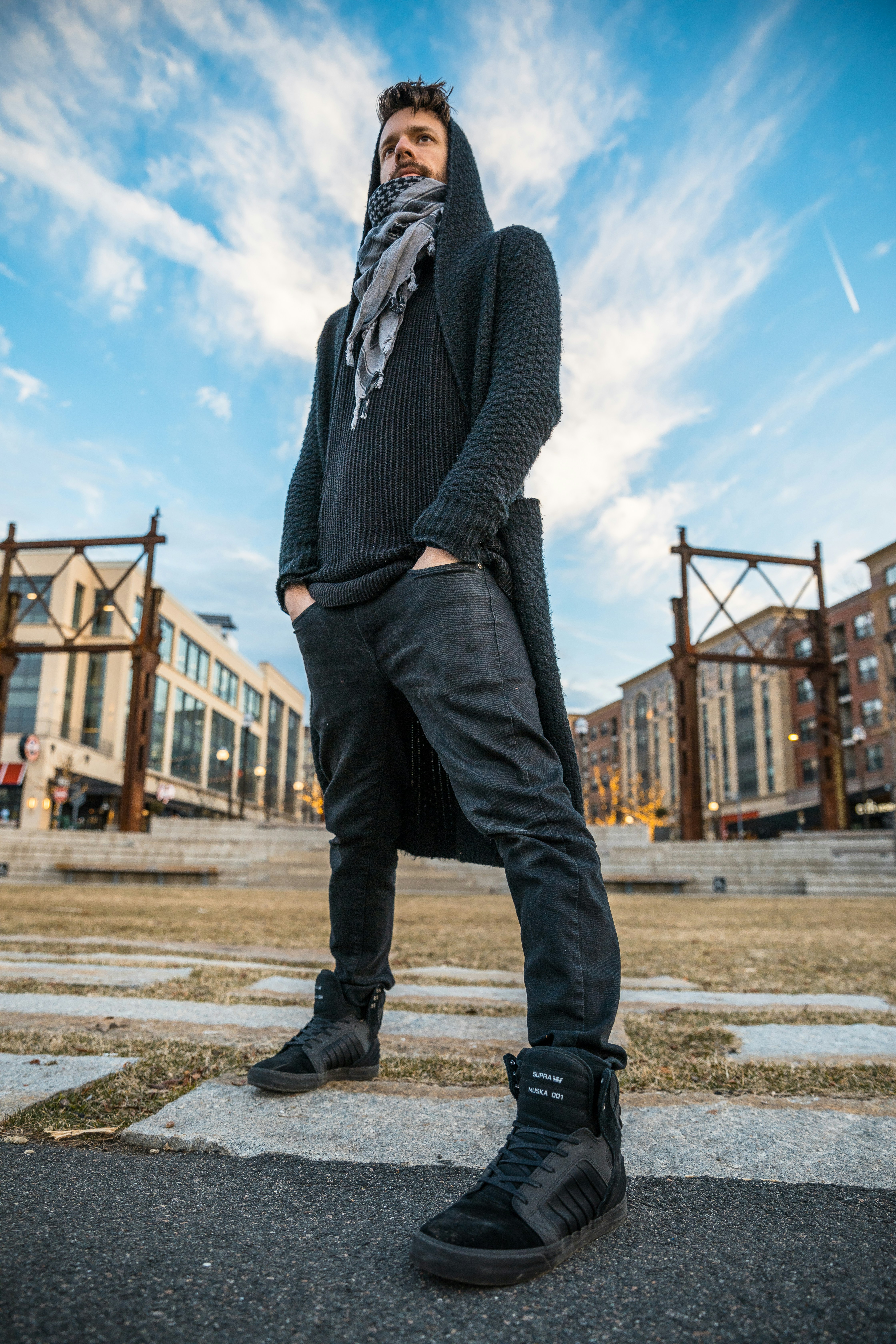 肖像,站立,时尚,男性,围巾,建筑,站立,城市,街道,风格,男人,工业,鲨鱼眼,连帽衫,黑色衣服,鞋子,口袋里的手,向外看,街道穿,外面