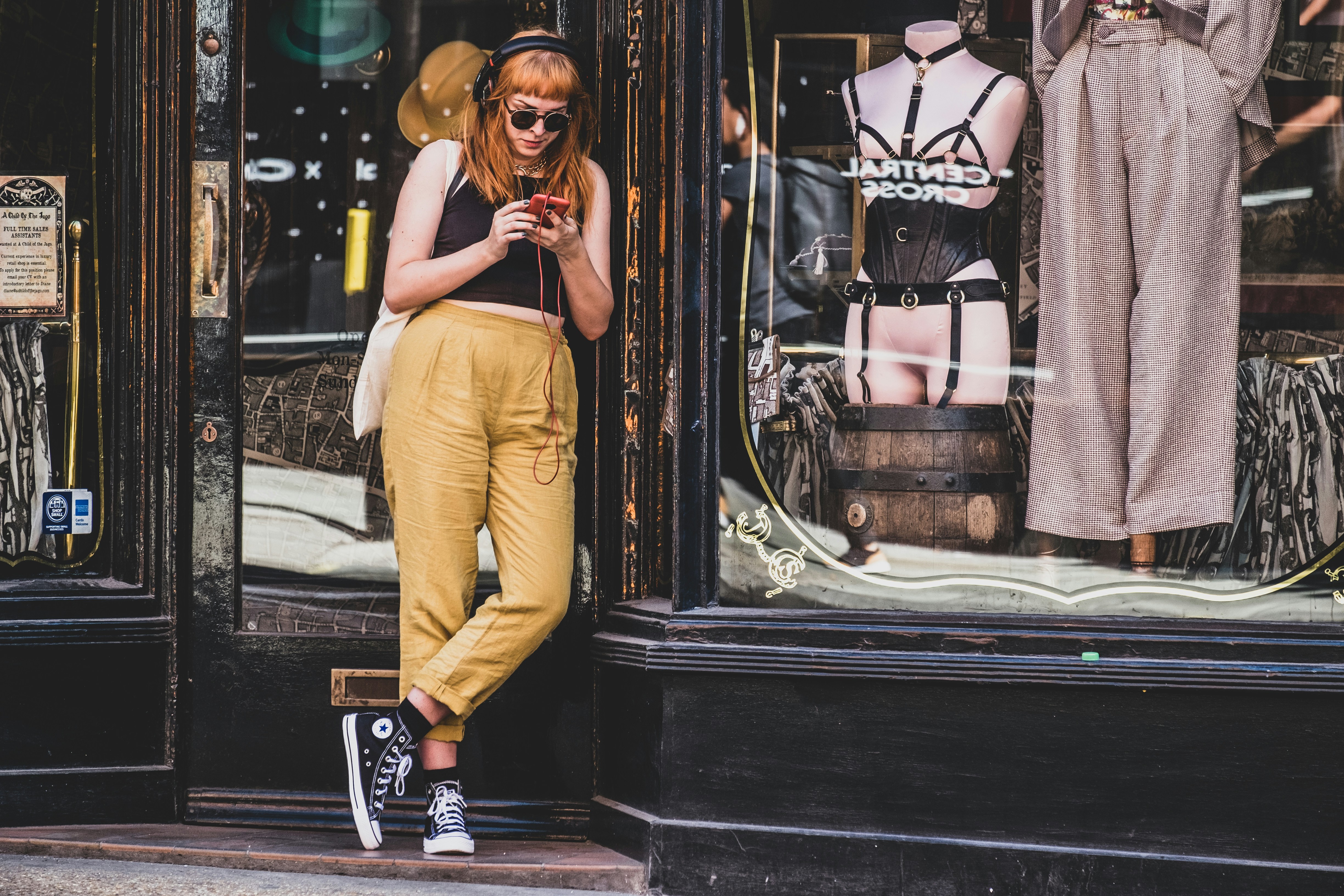 女,女,黄裤,街头艺术,用手机、鞋子、匡威、眼镜、红头