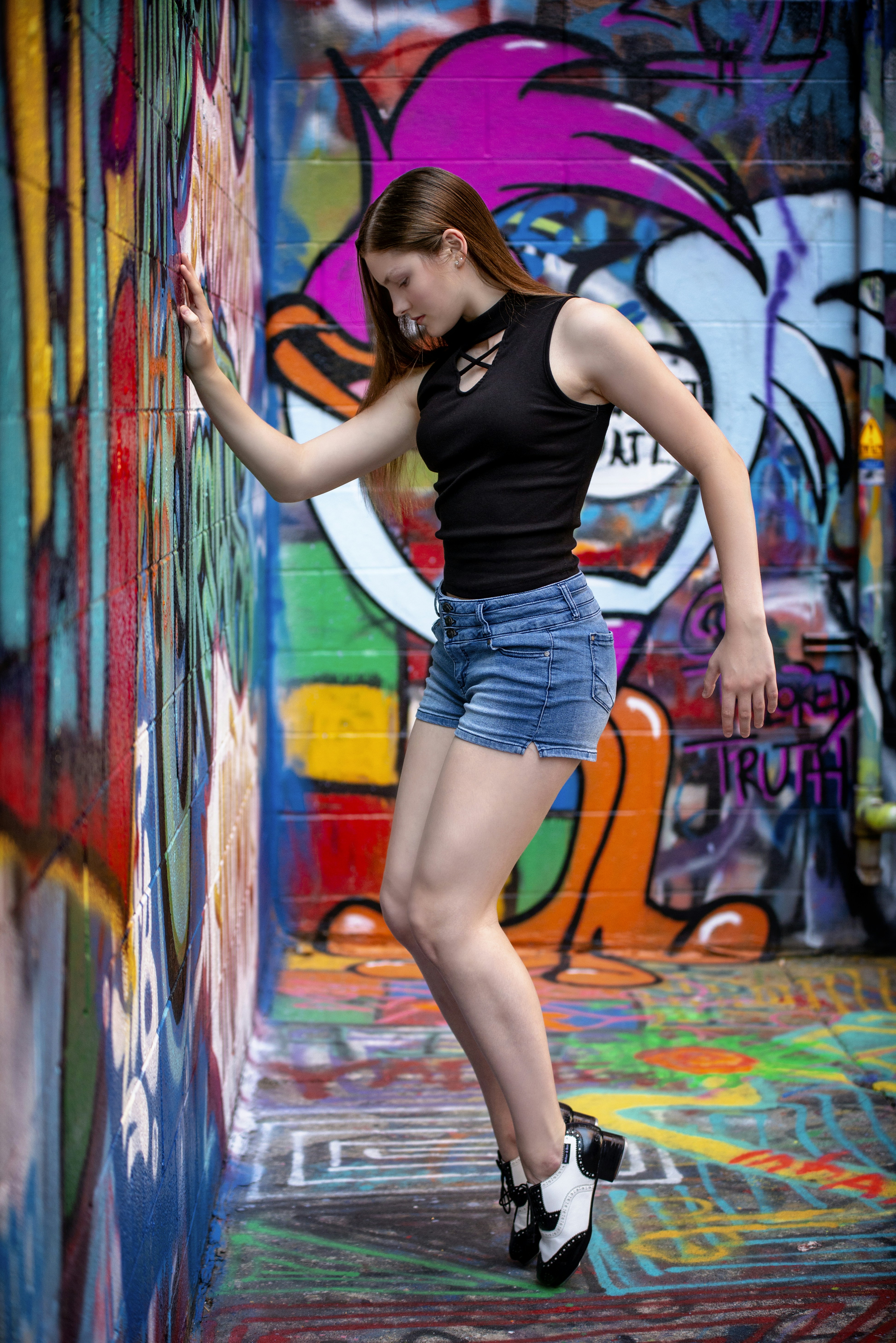 女人,女人,鞋子,涂鸦,墙壁,壁画,街头艺术,艺术家,舞蹈,牛仔裤,短裤,时尚,风格,尖头,踢踏舞,模型,姿势,城市,安乔木