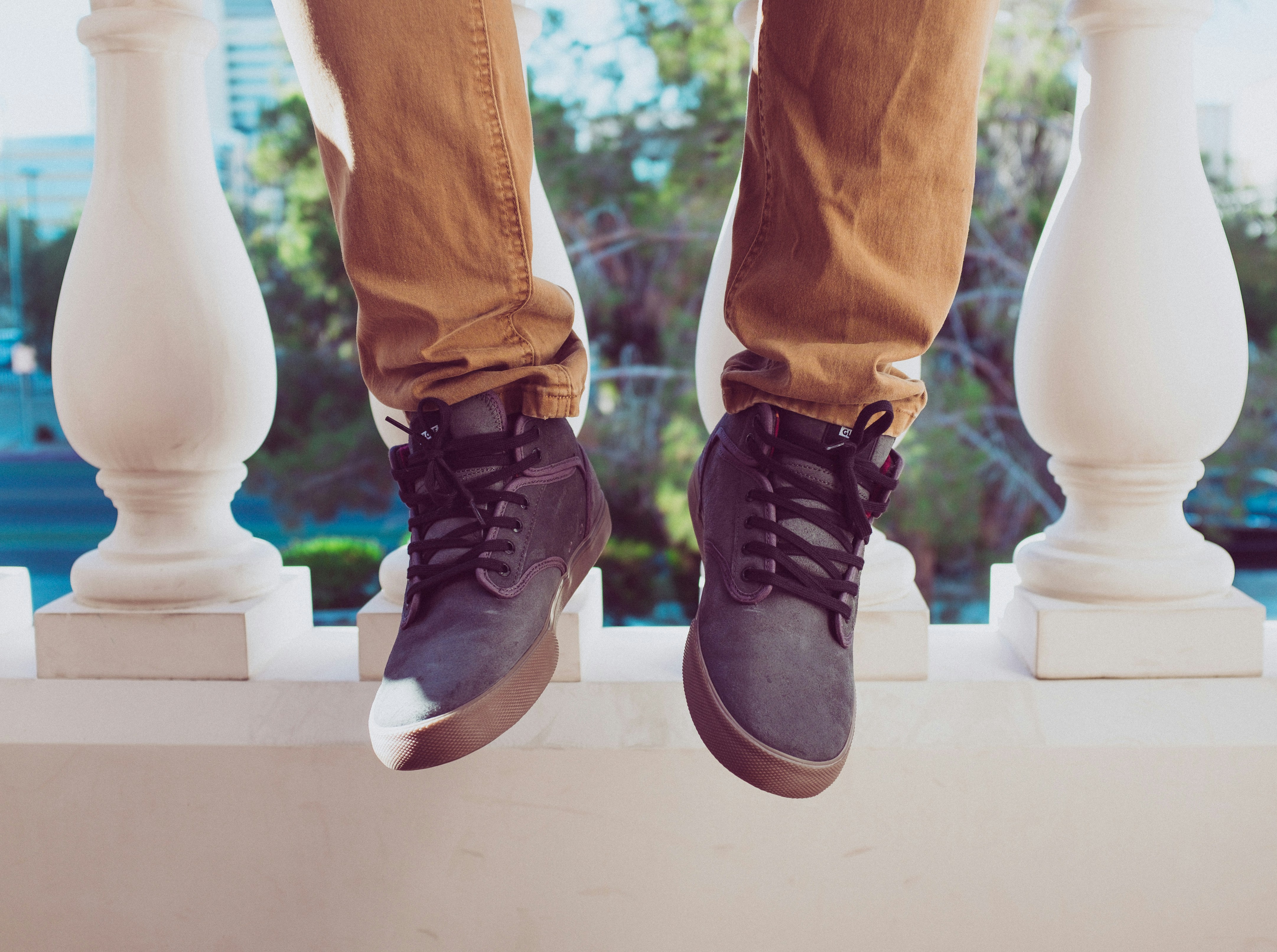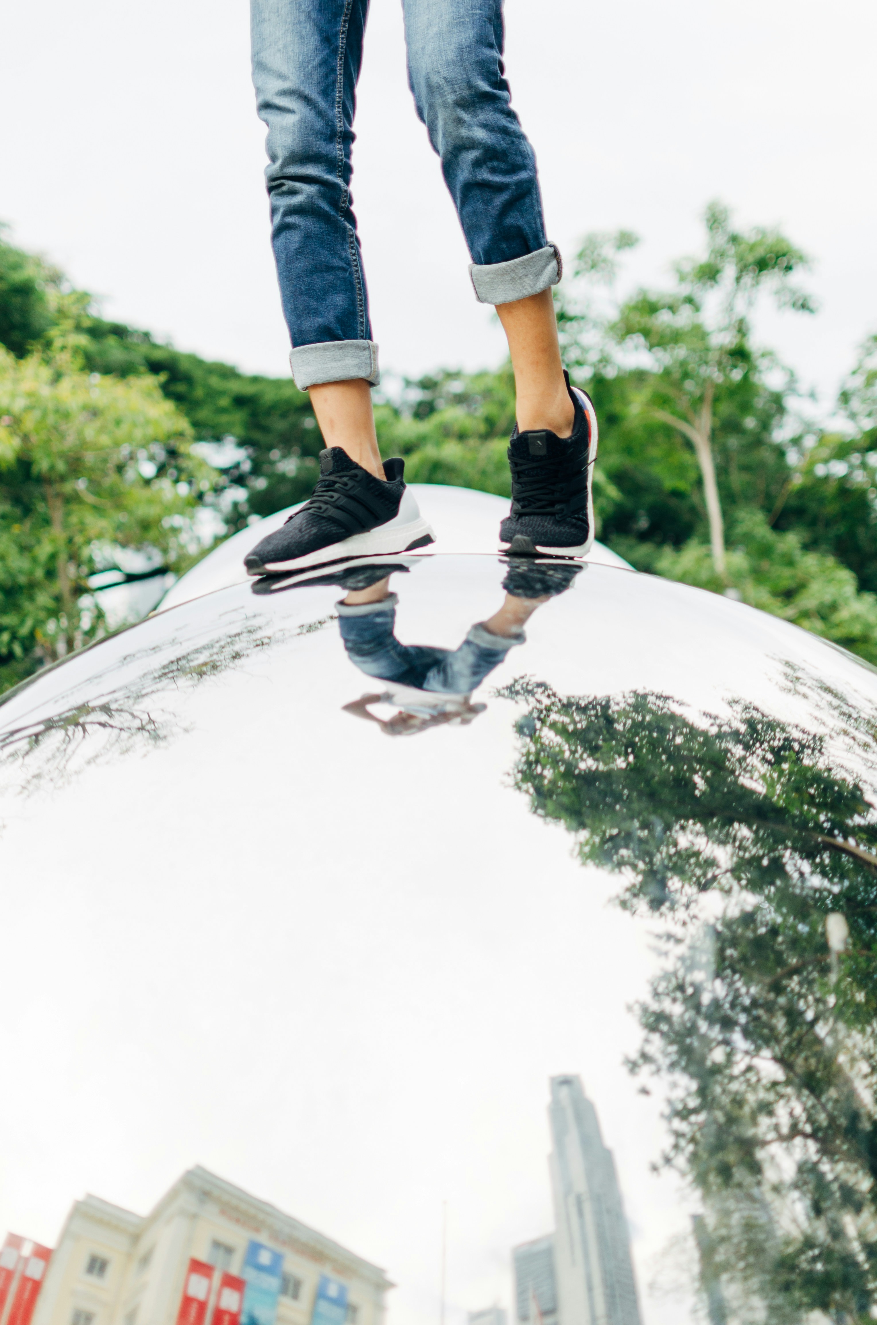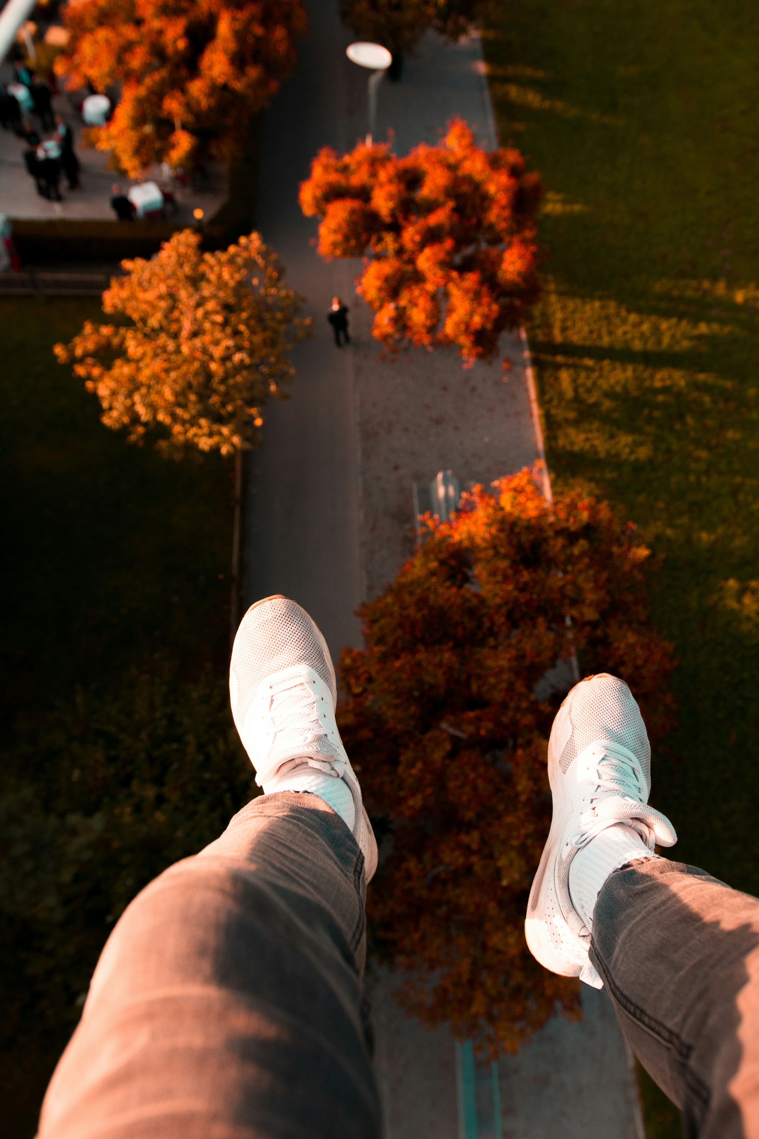 close up of person's legs with ripped jeans above parked cars and sidewalk with streetlights, cleveland