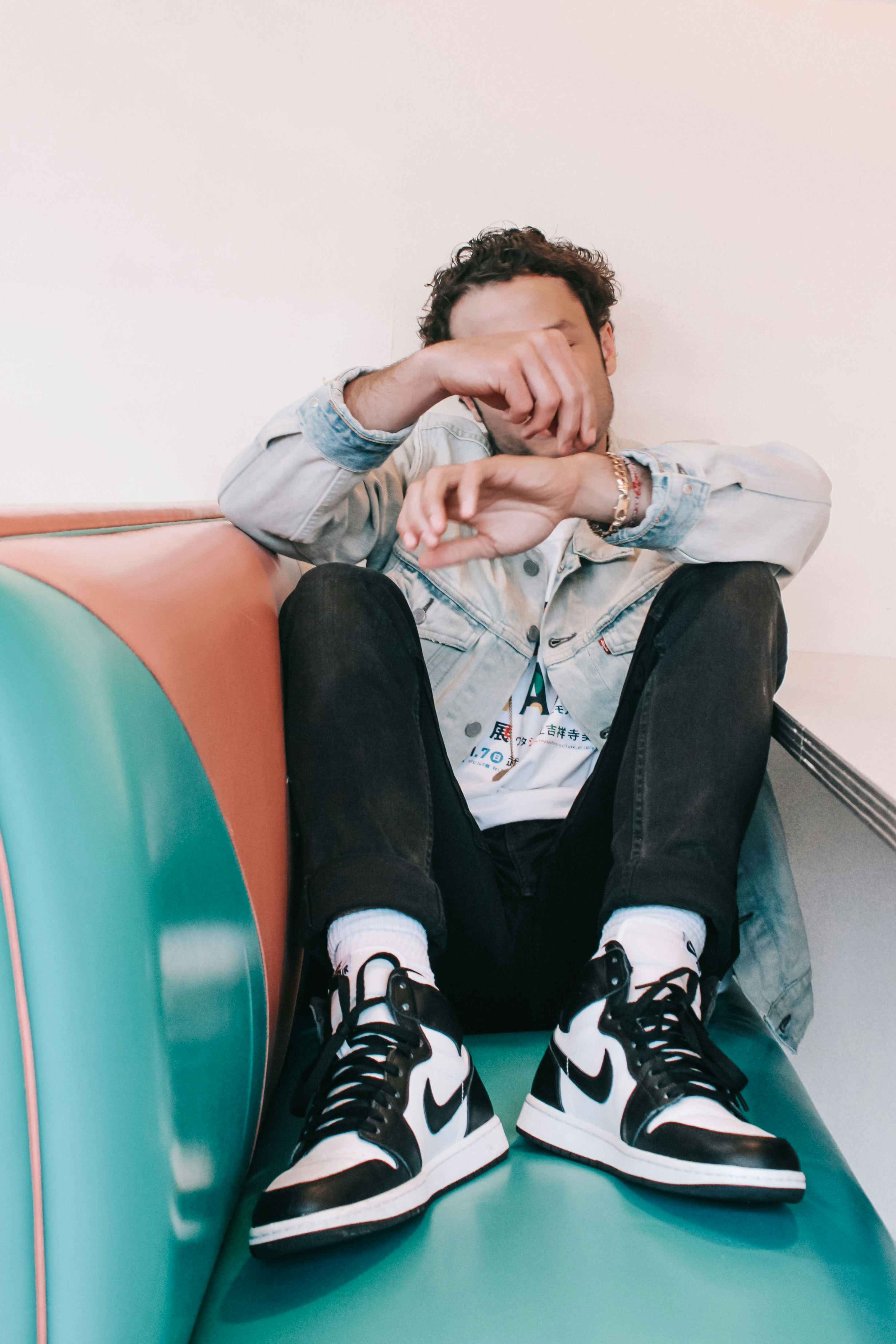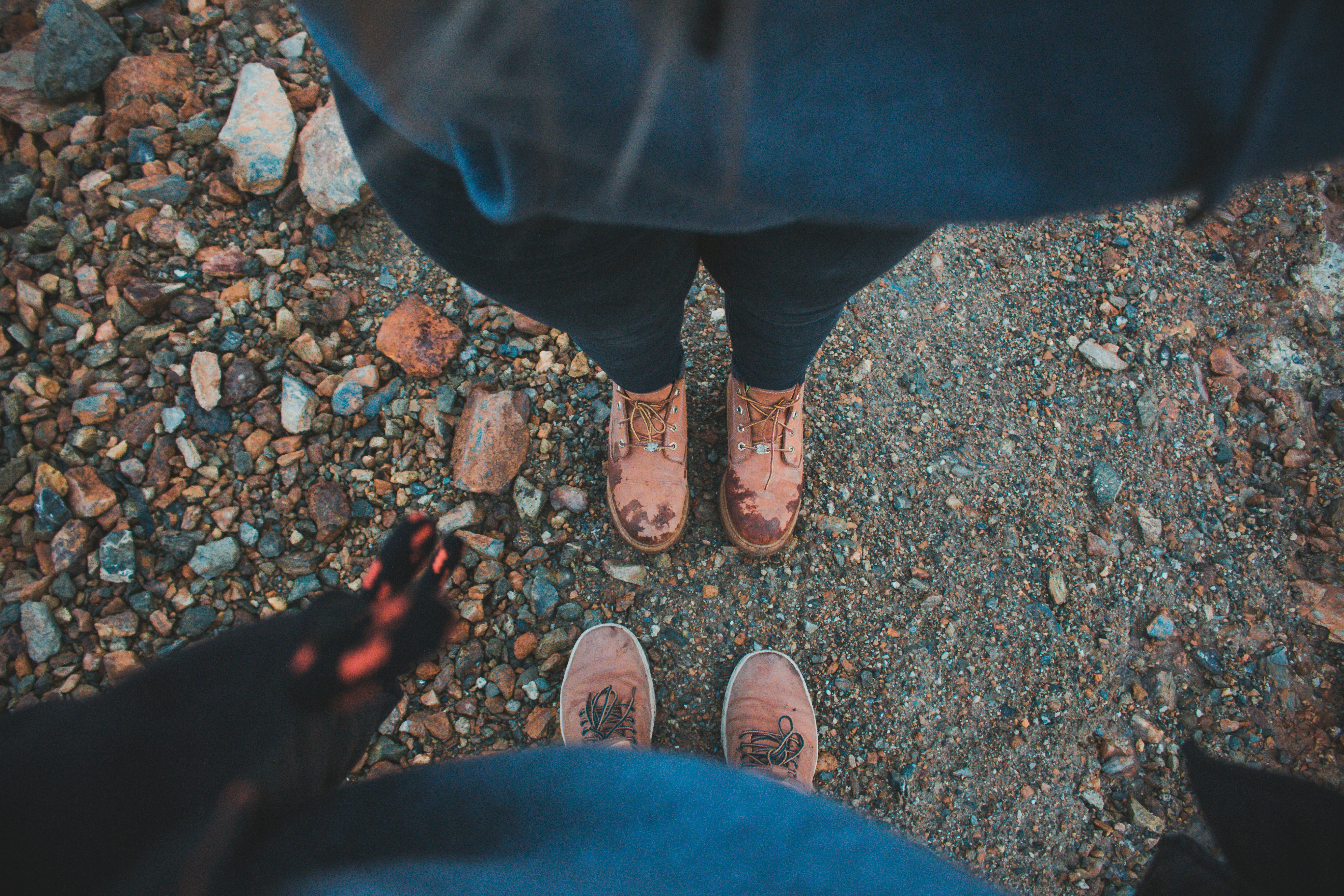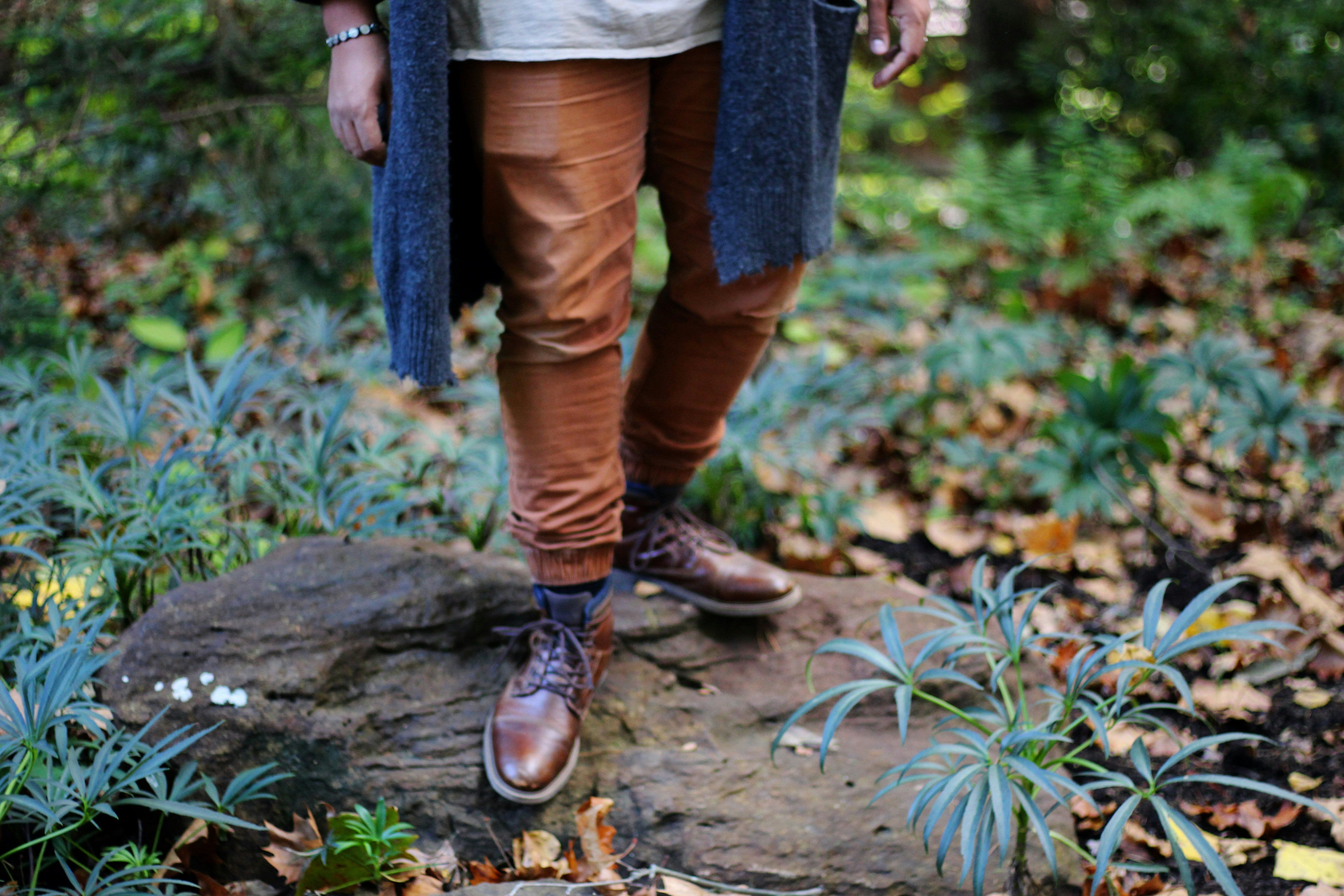 close up of person's legs with ripped jeans above parked cars and sidewalk with streetlights, cleveland