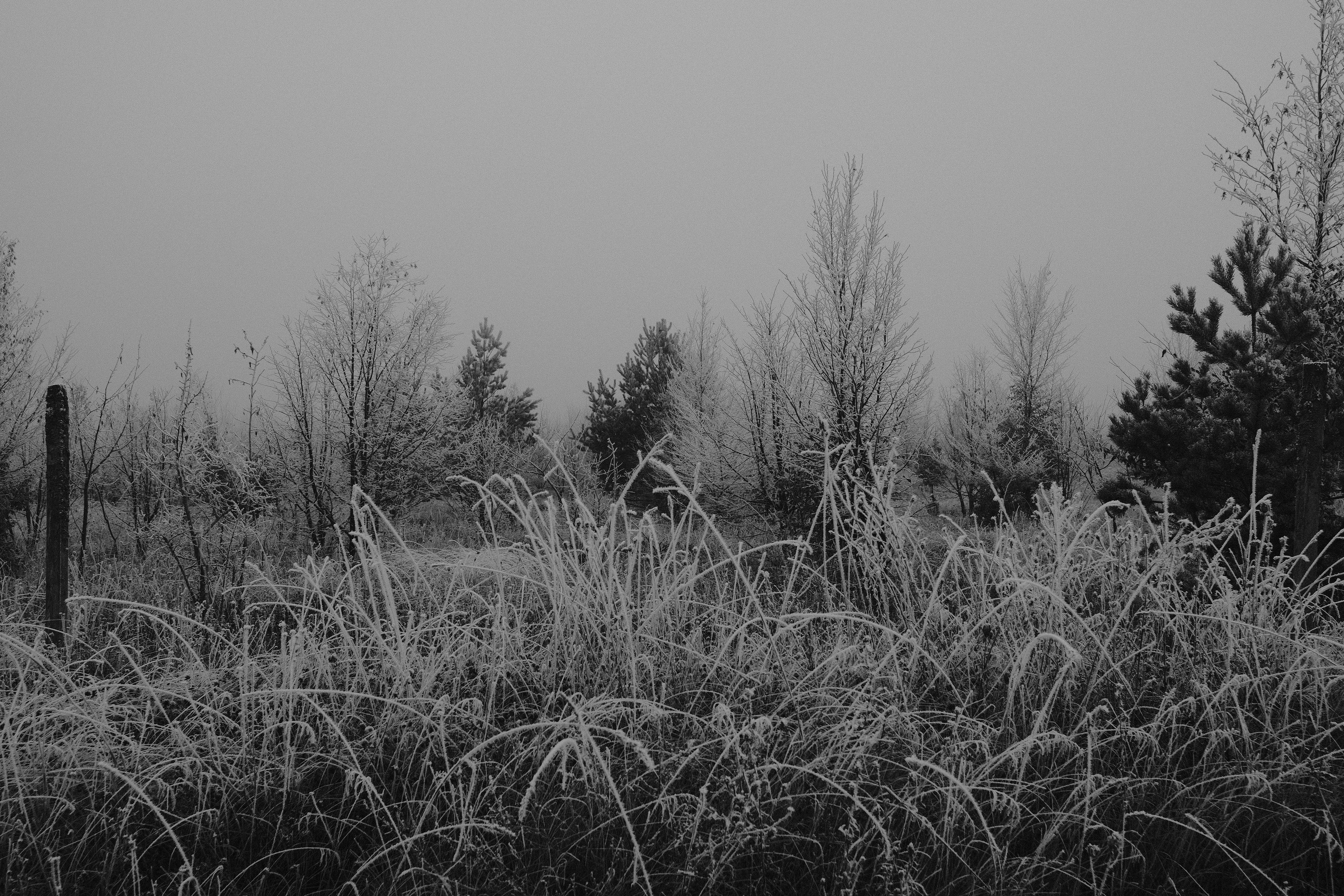 草、霜、冰、树、林地、森林、冰冻、自然、白色、黑色、黑色和白色,BW