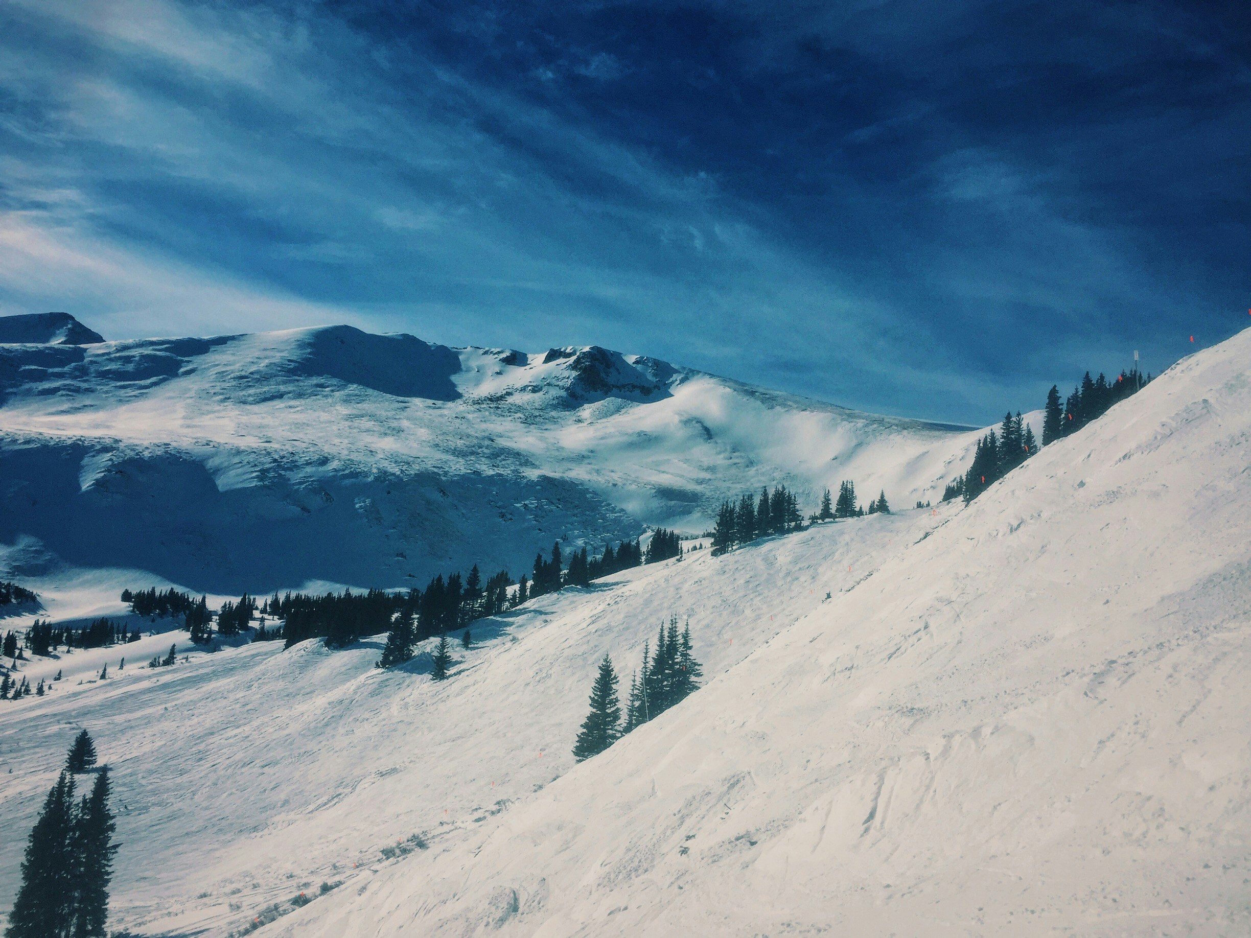 Snow covered mountains and trees with a dark blue sky in Keystone Ski Resort.