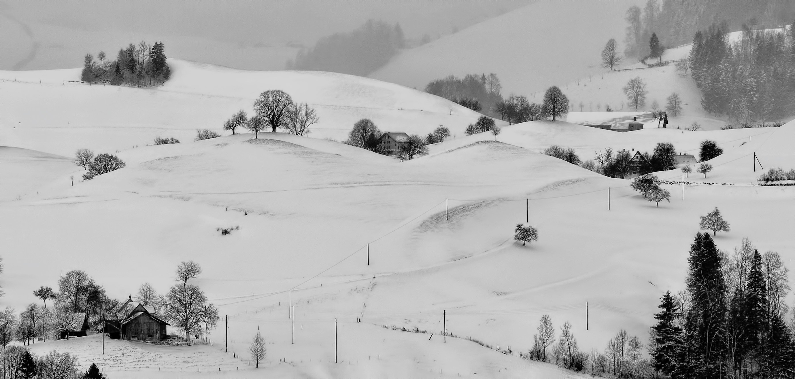 雪,农场,山,山坡,山坡,乡村,山,房子,树,农田,黑白