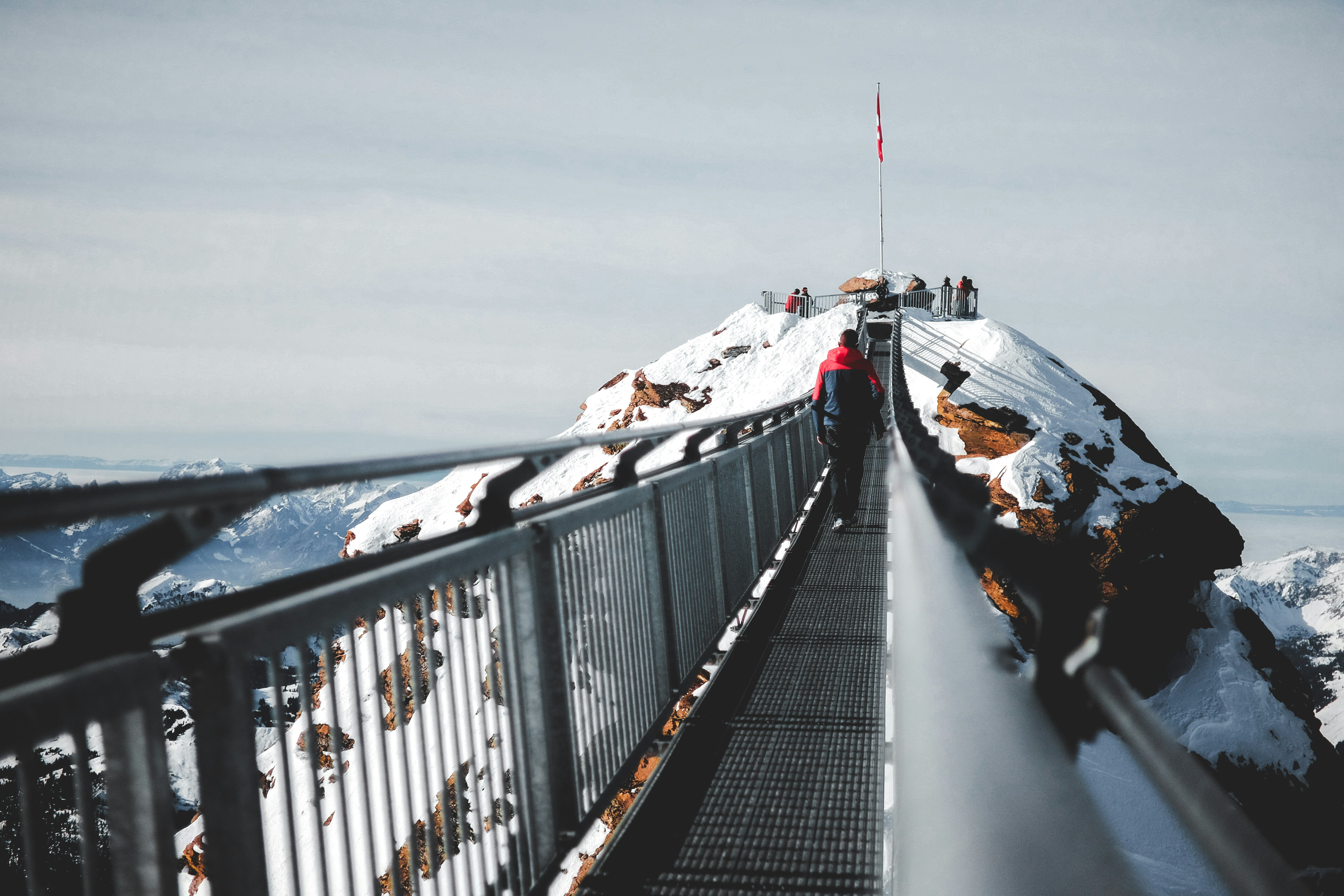 桥,篱笆,栏杆,山,悬崖,岩石,雪,路,路,人行道,白色,云彩,旗帜,山顶,自然,旅行,旅行,野生,山顶,户外
