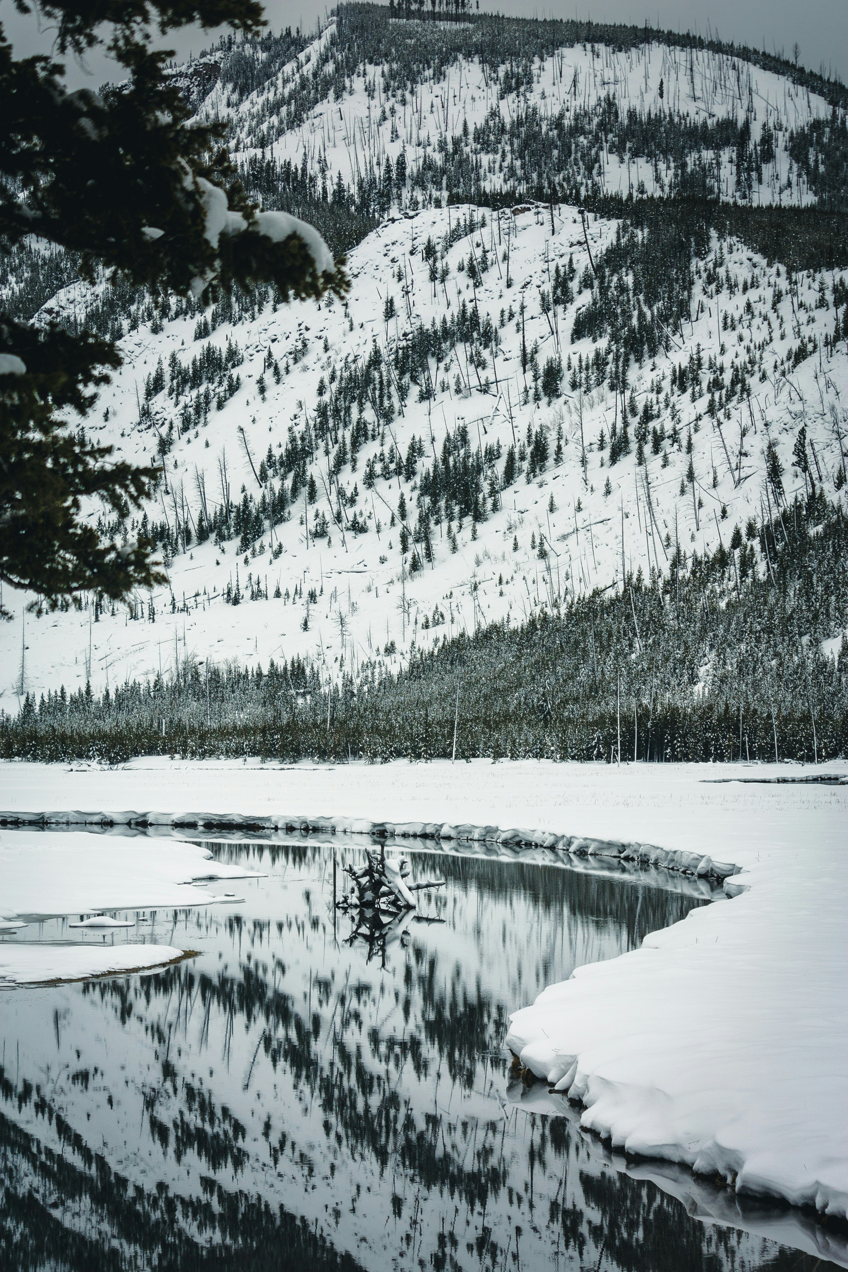 山,森林,雪,水,反射,树,国家公园,黄石公园