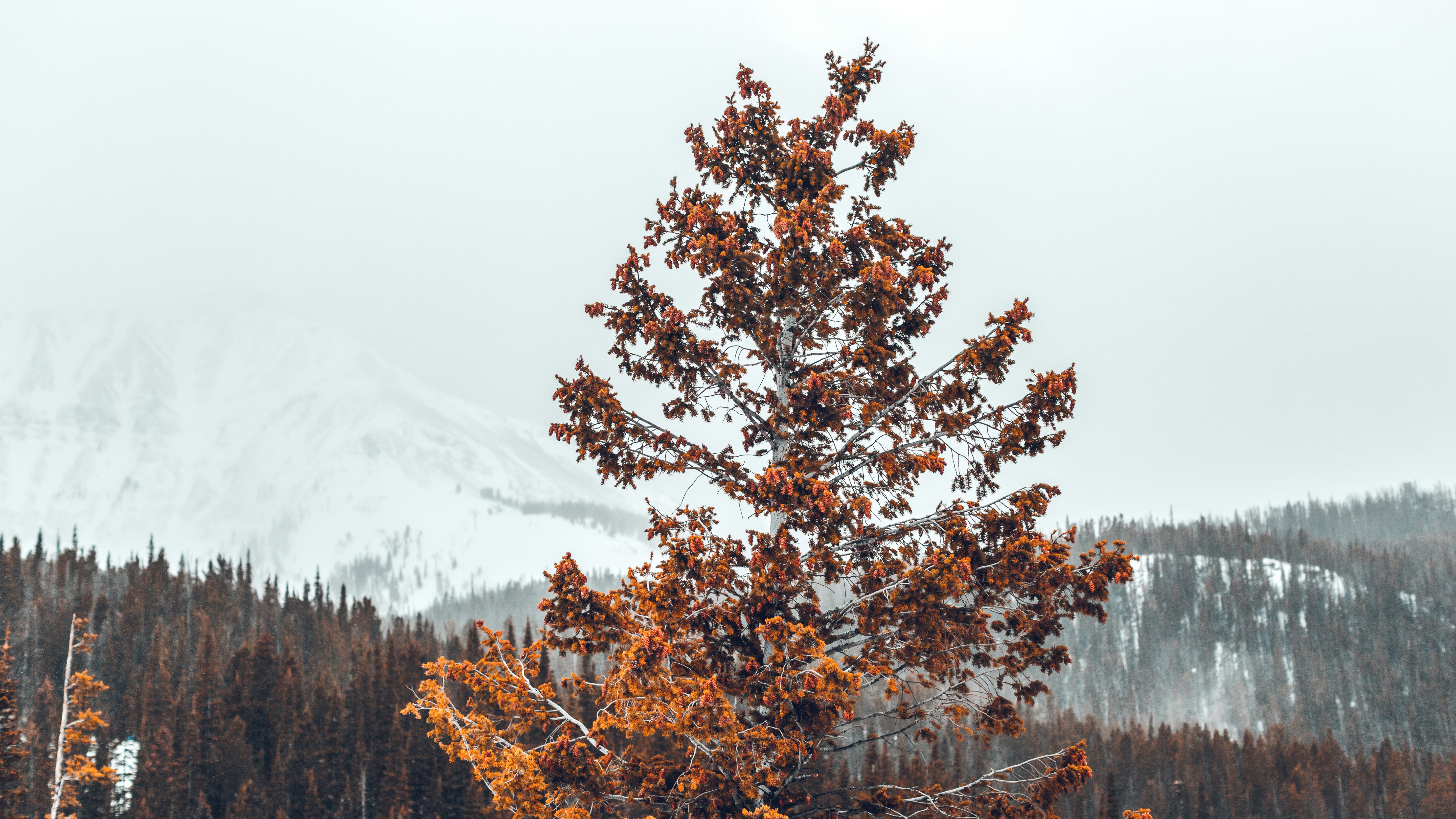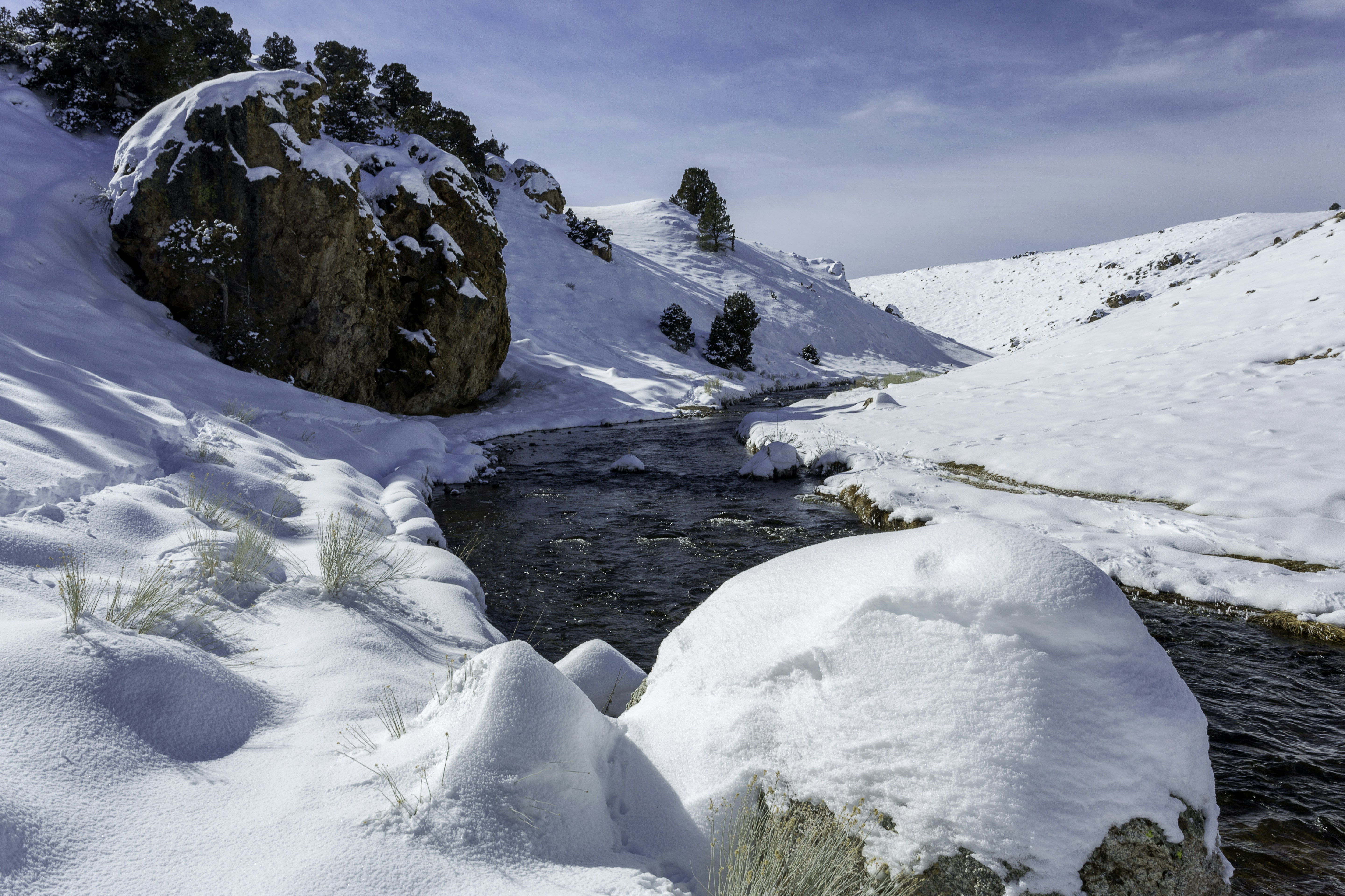 A scenic view of a snow covered mountain top with fog and a clear blue sky in Indio.