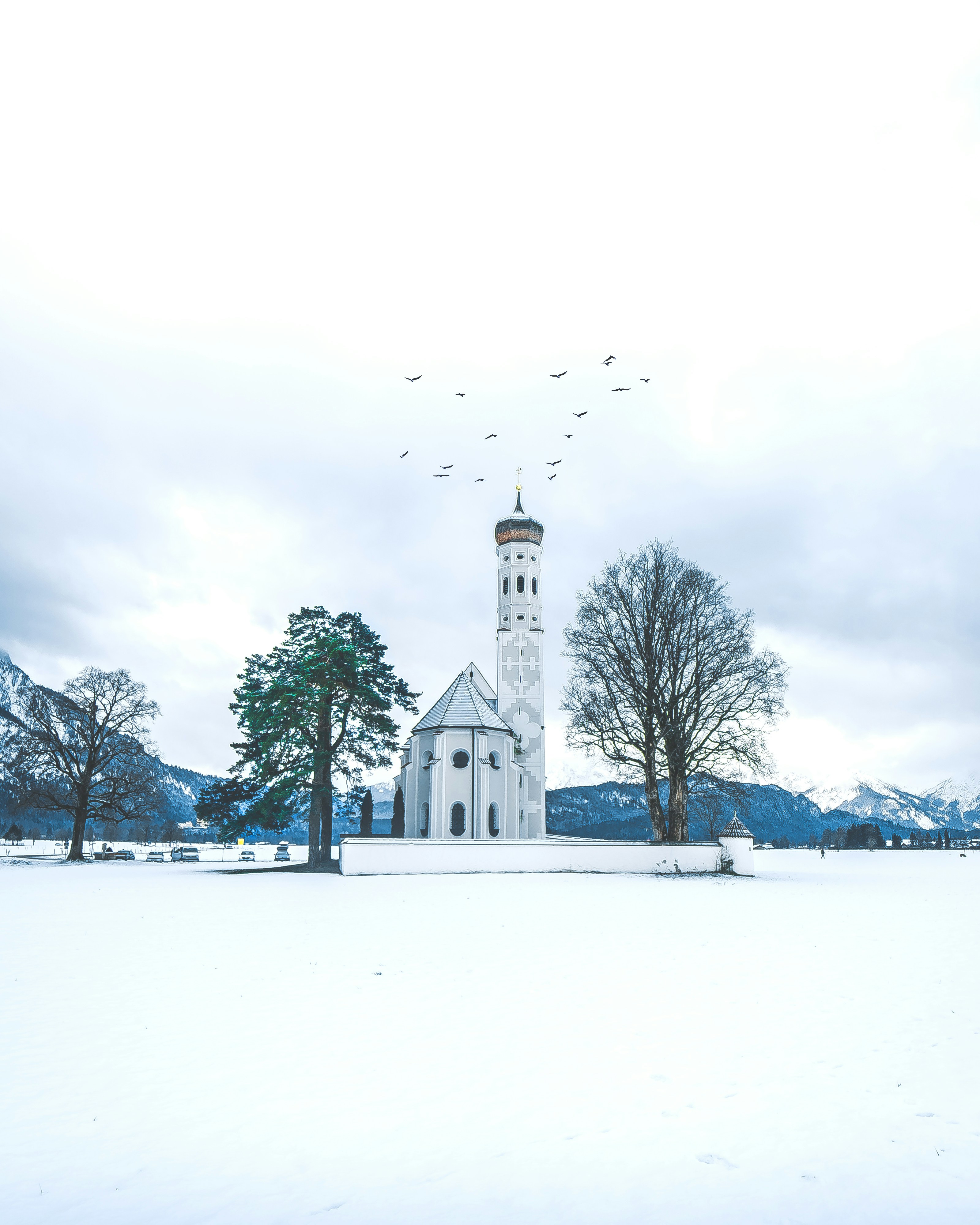 building,architecture,church,snow,tree,birds,gold,grey,blue,green,white,rising,gebäude,bayern,berge,mountain,vögel,bird,germany,deutschland