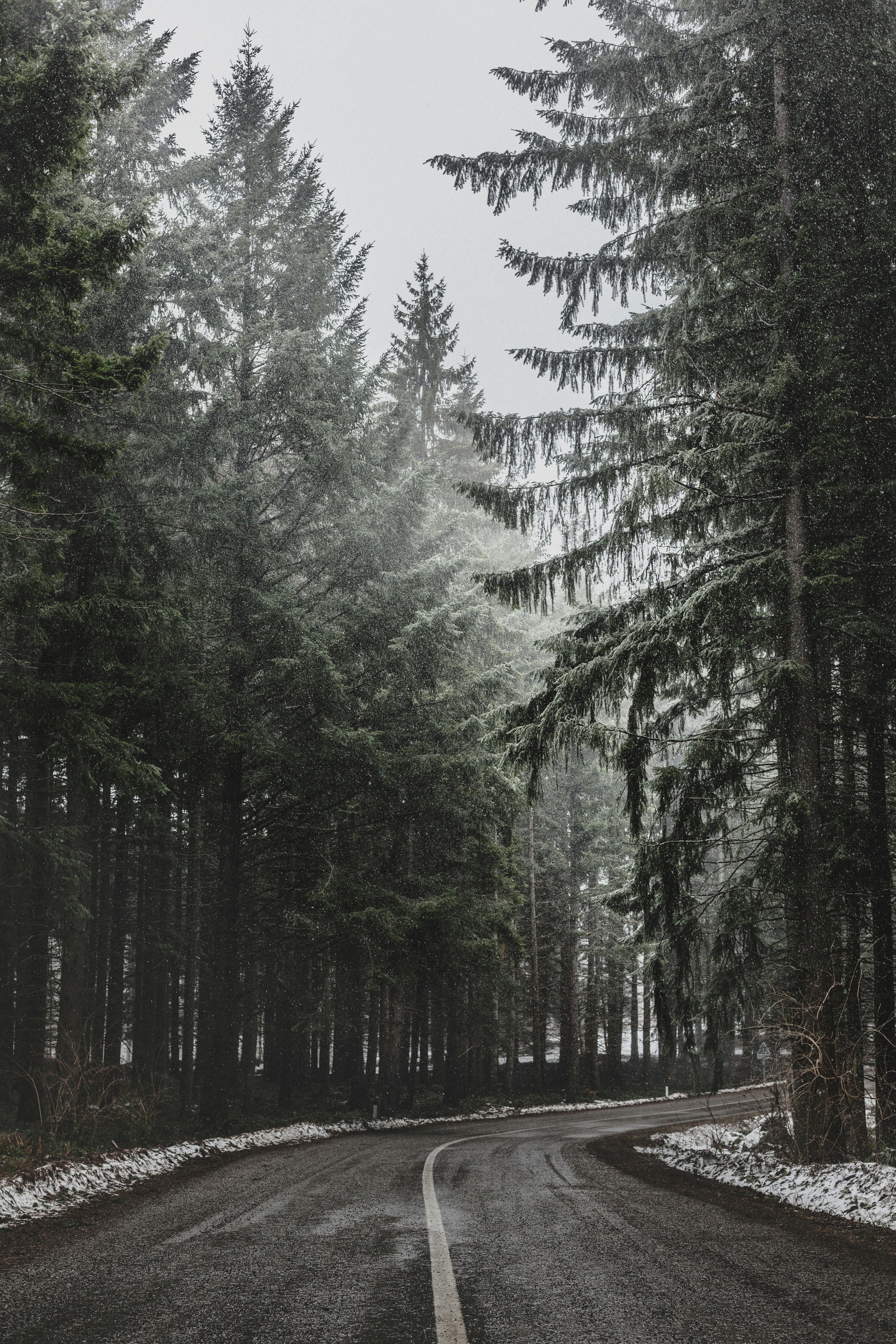 A desaturated shot of a curve in an asphalt road lined with coniferous trees in Goč